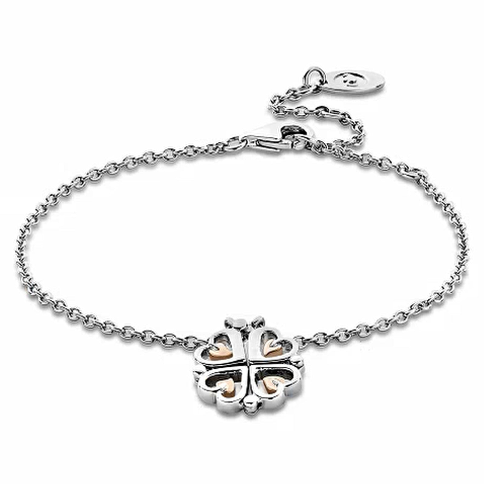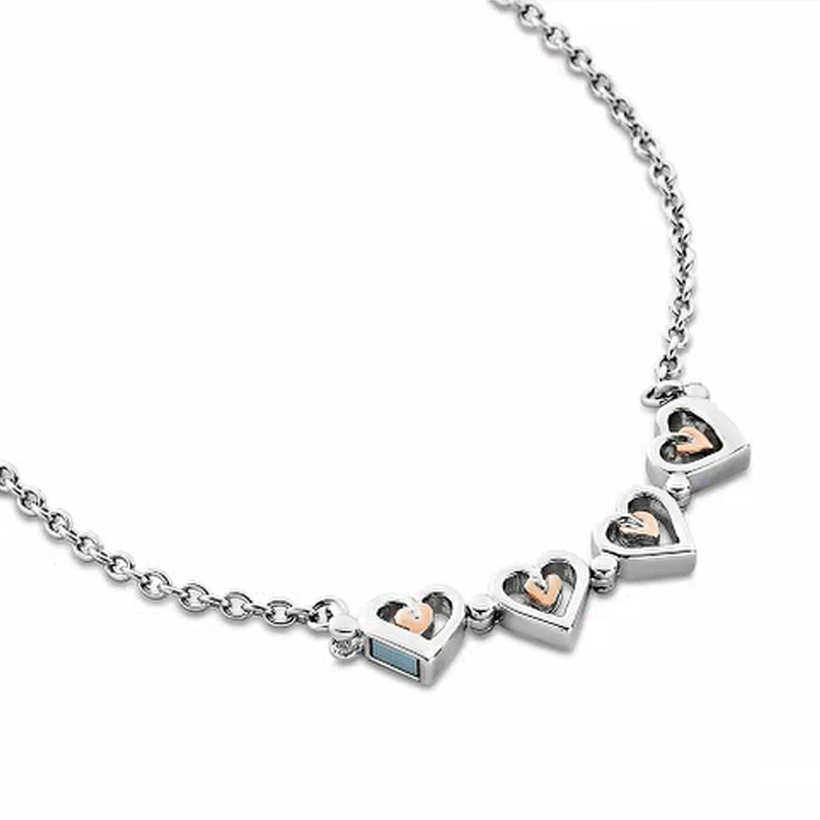 Clogau Tree of Life Heart Bracelet 3SHEA768. Clogaus iconic Tree of Life motif symbolises creation, growth and renewal, making a wonderfully uplifting addition to your outfit. The sweeping heart-shaped vines of this Tree of Life Sterling Silver Heart Bracelet are tipped with 9ct rose gold detailing and clustered to form a pretty four-leafed flower which opens into a string of hearts. Length: 19cm