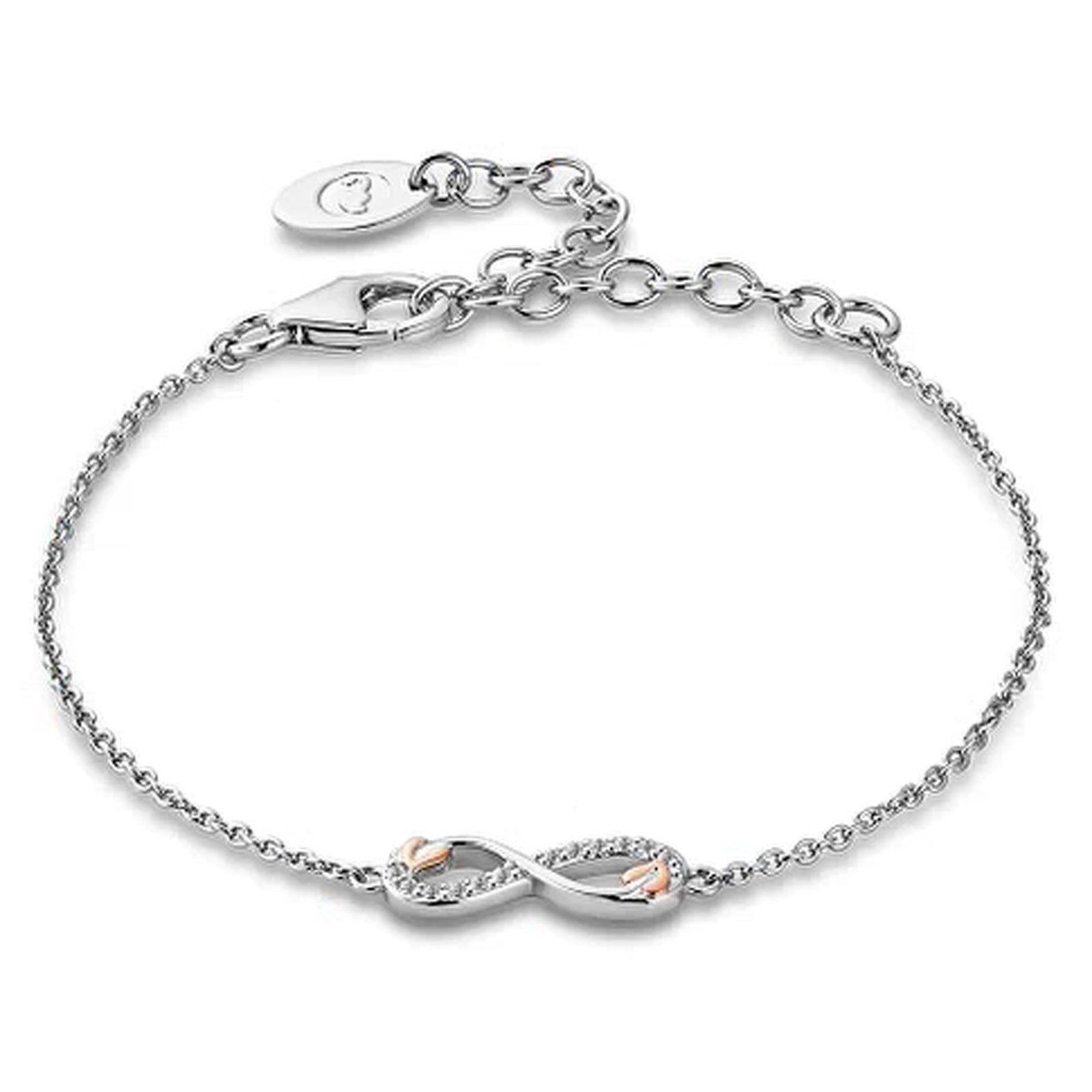 Clogau Tree Of Life Infinity Bracelet 3STOL0737. A romantic interpretation of the infinity symbol, Clogau Tree of Life Infinity Silver Bracelet features sweeping, sparkling curves of sterling silver and white topaz tipped with their signature leaf motif, signifying a love that will continue to grow for eternity. Width: 1.47cm. Height: 1.0cm. Length: 19.0cm.