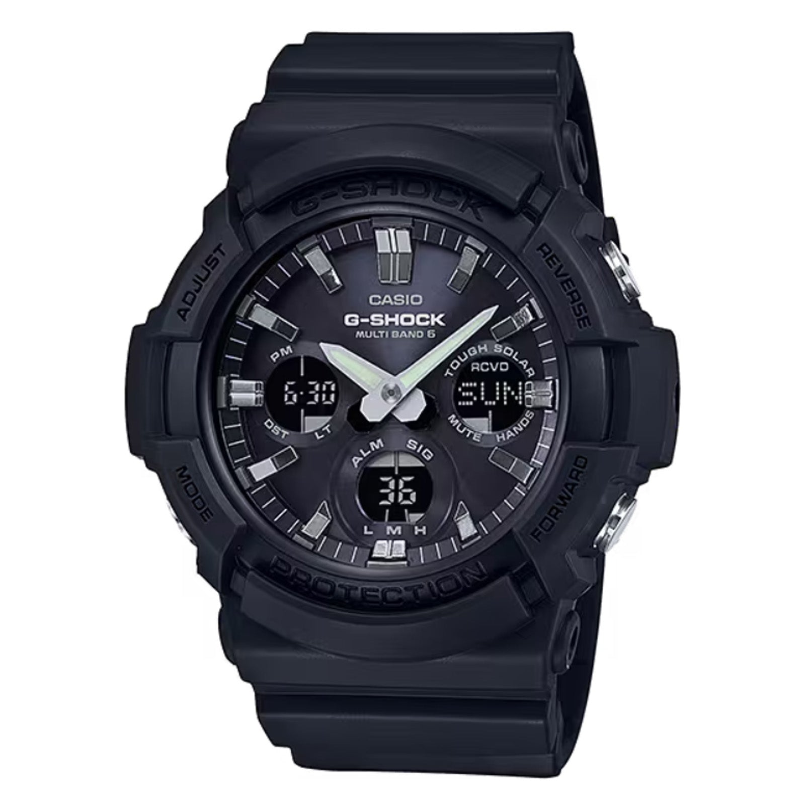 Casio G Shock GAW-100B-1AER. This GAW-100 series G Shock has a black case and matching resin strap. With a dual display dial, it has radio controlled time keeping as well as many other features such as world time, timer, stopwatch, 5 alarms and hourly time signal. It is powered by the Casio Tough Solar technology, so it never needs a battery change and is powered by any light source. Along with a 200m water resistancy and the G Shocks ruggedness it can withstand all of life's challenges. Case size (Lx Wx H) 55.1 x 52.5 x 16.7mm