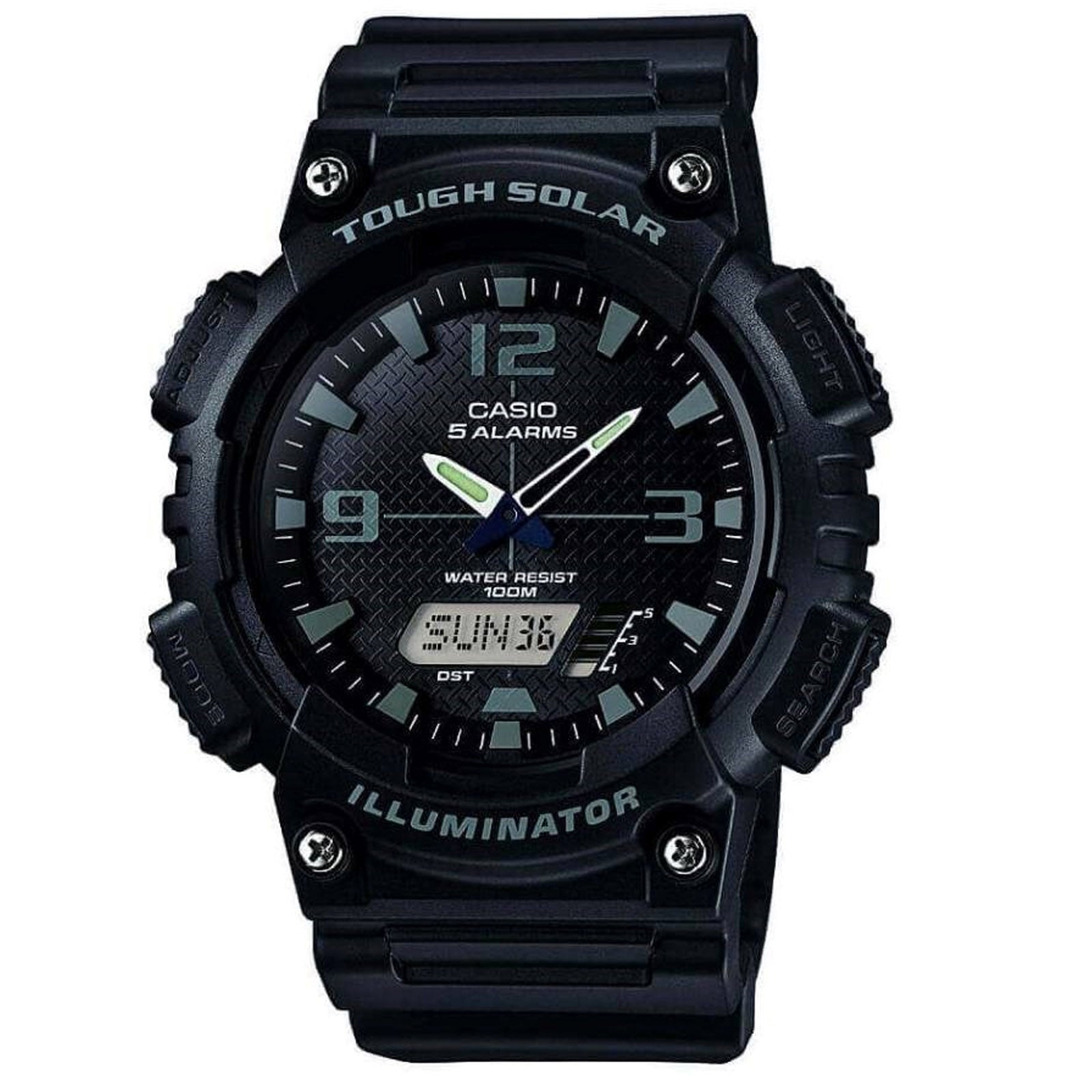 Casio Gents Solar Powered World Timer Black Watch. Case size (L× W× H)52.2 × 48.3 × 13.7 mm Weight 40 g Case and bezel material Resin Band Resin Band Water resistance 100-metre water resistance Power supply and battery life Solar powered Glass Resin Glass Other Neobrite Watch Features: World time 31 time zones (48 cities + Coordinated Universal Time), daylight saving on/off, Home city/World time city swapping Stopwatch 1/100-second stopwatch Measuring capacity: 59'59.99'' Measuring modes: Elapsed time, lap time, split time Timer 2 countdown timers Can be used during interval training that alternates between two different paces. Measuring unit: 1 second Input range: 00'05'' to 99'55'' (1-minute increments and 5-second increments) Other: Number of repeats settable from 1 to 10 Alarm/hourly time signal 5 daily alarms Hourly time signal Light LED light (LCD part only) Selectable illumination duration (1.5 seconds or 3 seconds), afterglow Light color LED: Amber Calendar Full auto-calendar (to year 2099) Mute feature Button operation tone on/off Energy saving feature Power Saving (display goes blank to save power when the watch is left in the dark) Battery display/alert Battery power indicator Run time Approx. battery operating time: 10 months on rechargeable battery (operation period with normal use without exposure to light after charge) 23 months on rechargeable battery (operation period when stored in total darkness with the power save function on after full charge) Accuracy Accuracy: ±30 seconds per month Other features 12/24-hour format Regular timekeeping: Analog: 2 hands (hour, minute (hand move every 20 seconds)) Digital: Hour, minute, second, pm, month, day, 6-language day of the week indicator (English, Portuguese, Spanish, French, German, Italian)