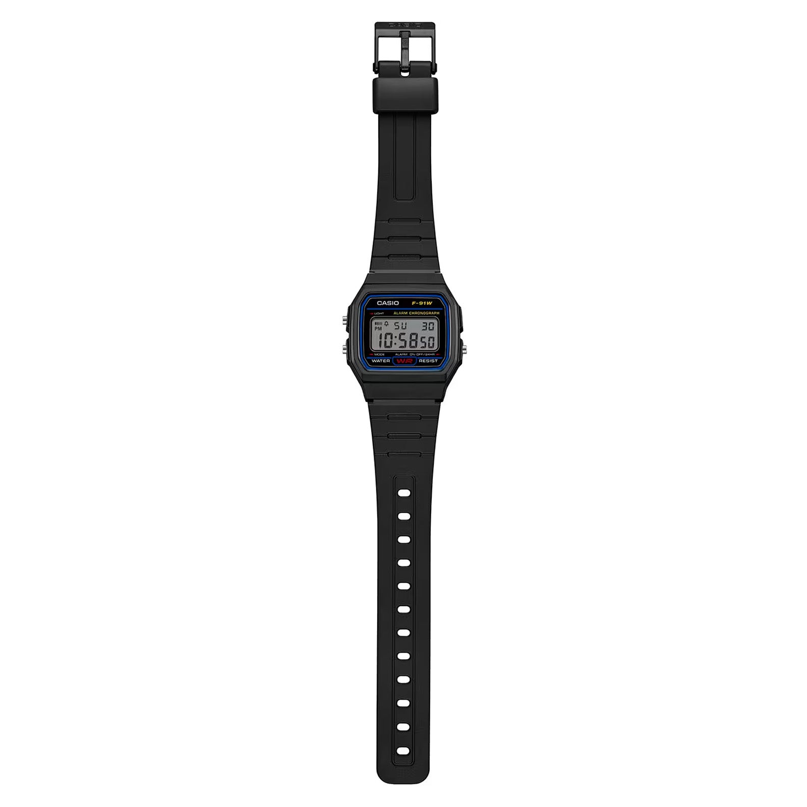 Casio black classic digital F-91W-1YER. Featuring a digital display, 100th sec stopwatch, alarm and a microlight. Digital time display can be configured to either 12-Hour or 24 Hour Format. Alarm Function - Daily Alarm: Sounds each day at the time you set, Hourly time signal: The watch beeps every hour on the hour. Stopwatch Function - Measuring Capacity: 60 minutes, Measuring Modes: Elapsed time, split time, 1st-2nd place times, Measuring Unit: 1/100th second. Black case with a matching black resin strap. Dimensions 38.2 x 35.2 x 8.5 mm. Water Resistant: Splash Resistant.