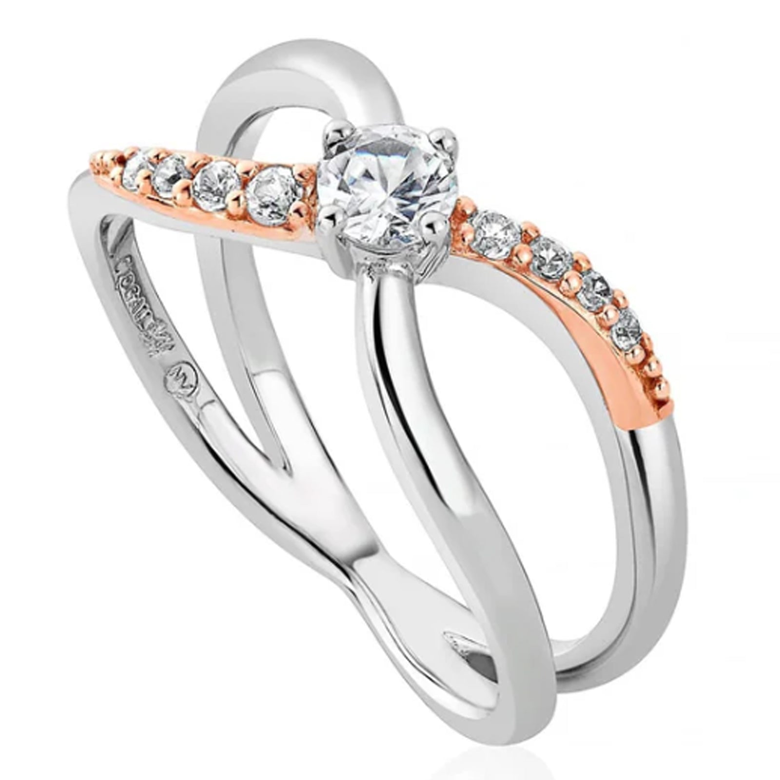 Clogau Kiss Ring 3SCGKR. A kiss can mean so many things, from the excitement of new beginnings to the tenderness of a long-held love. This beautiful Clogau Kiss Silver Ring is an unforgettable reminder of your precious moments, carefully crafted from sterling silver and 9ct rose gold, and set with sparkling white zircon. Whatever the occasion, seal it with a Clogau Kiss. Width: 0.8cm. Height: 0.4cm
