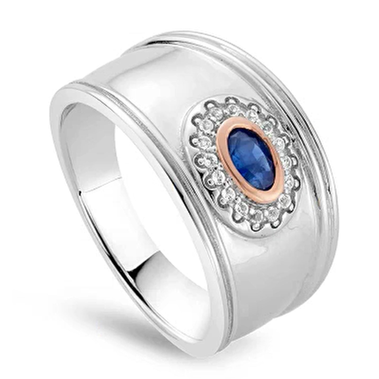 Clogau Princess Diana Sapphire Wide Ring 3SLDD0075. Princess Diana's iconic engagement ring grabbed worldwide headlines in 1981, and the ring's opulent centrepiece is given a wonderful modern interpretation with Clogau's Princess Diana Silver and Sapphire Ring. An eye-catching faceted blue sapphire is surrounded by 9ct rose gold and a halo of white topaz gemstones, all within a sterling silver setting. The epitome of style, like the Princess herself. Width: 1.2cm. Size P