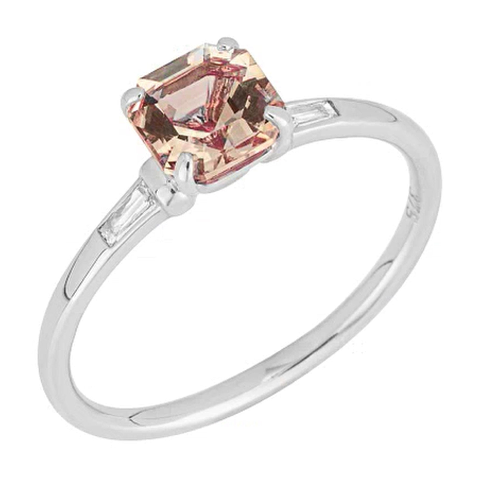 A magnificent pink colour inspired by a setting sun, this ring features sparkling asscher cut morganite and trapeze cut diamond stones. Crafted in 9ct white gold, this ring is sure to complete any style for any occasion. Dimensions (WxHxD): 6 x 6 x 5.4mm. Diamond total 0.04ct