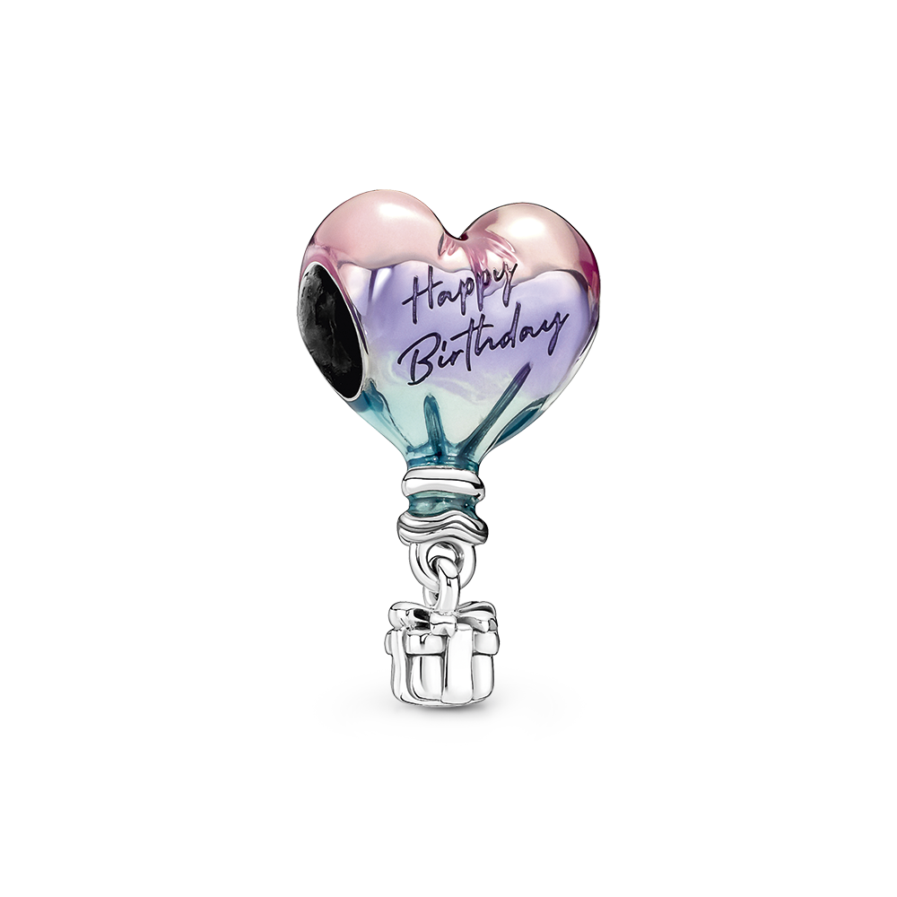 Happy Birthday balloon sterling silver charm with shaded transparent pink, purple and blue enamel