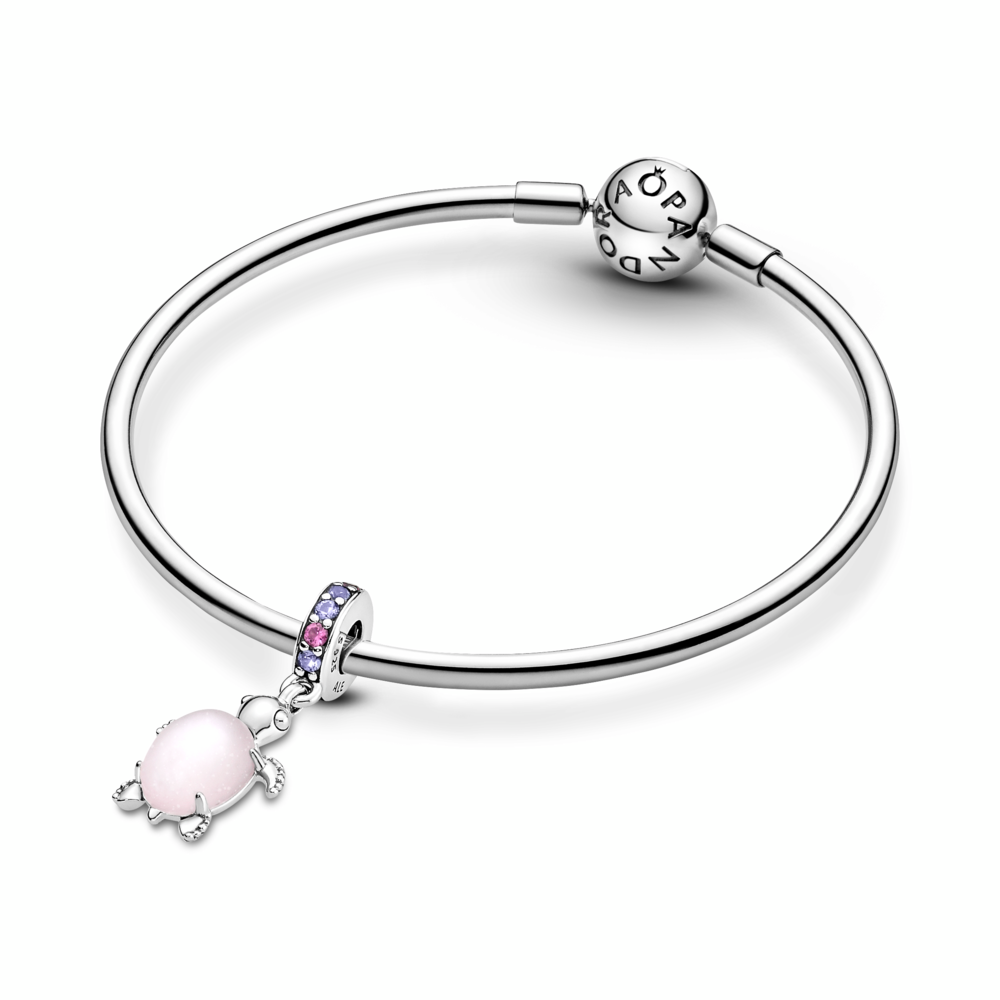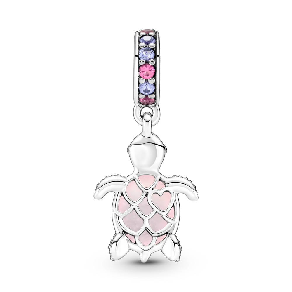 Our beloved sea turtle charm is joined by a new friend in soft, frosted pink. The sterling silver cut-out pattern on the turtle's belly shines through the Murano glass to create an intricate scale-like effect that dances with the light.