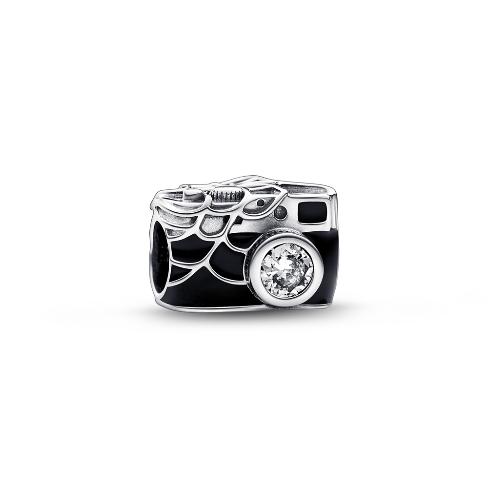 Marvel Spider-Man camera sterling silver charm with clear cubic zirconia, black, blue and transparent red enamel
