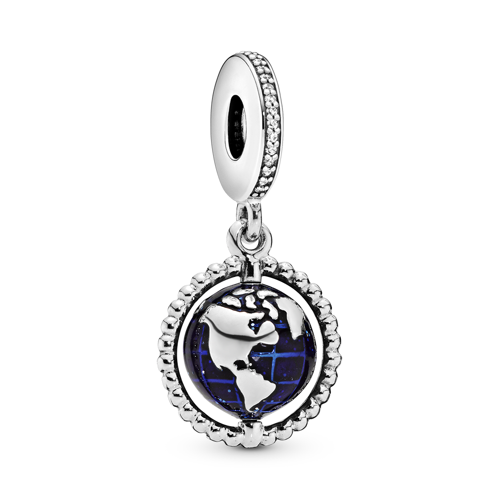 Globe silver dangle with clear cubic zirconia and blue enamel