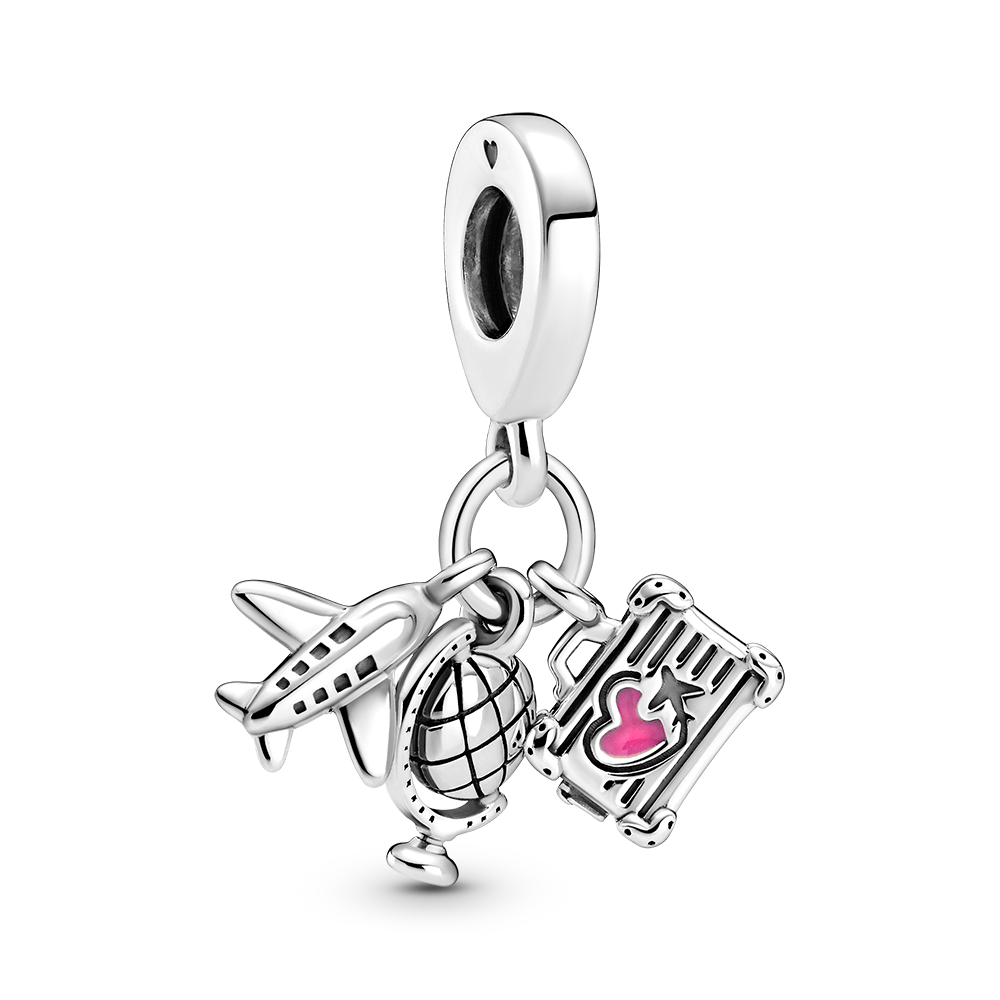 Airplane, globe and suitcase sterling silver dangle with pink enamel