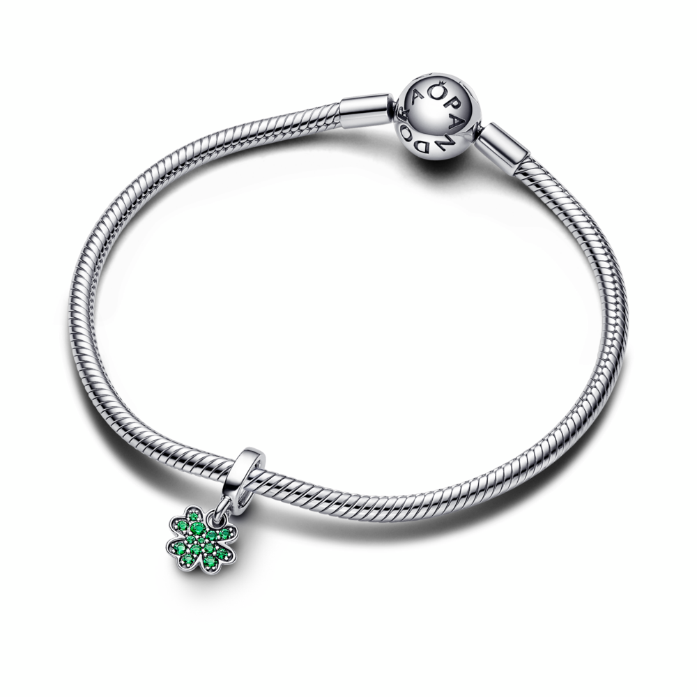 Channel your lucky side. This sterling silver dangle charm is inspired by the ultimate symbol of good fortune, the four-leaf clover. The sparkling green leaves are shaped as half hearts, and each leaf holds symbolism of its own: bringing faith, hope and love into the mix.