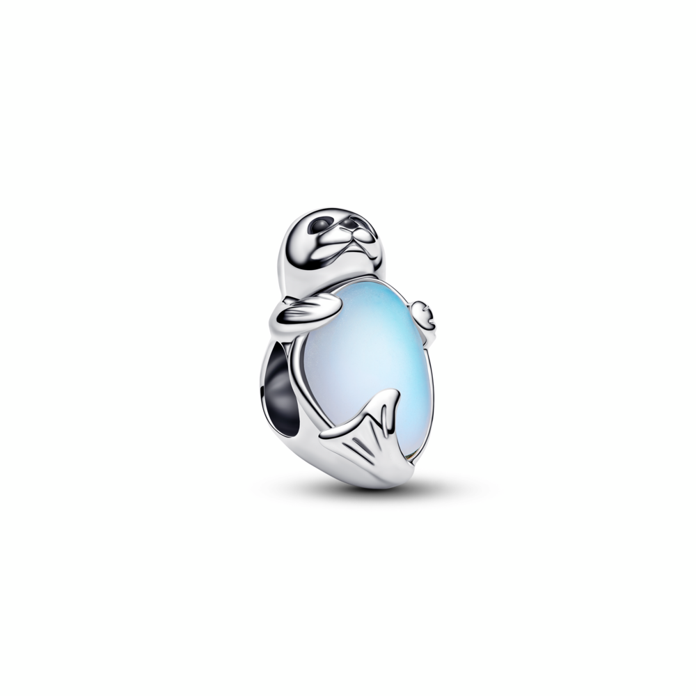 Dive into the magic of the sea. This sterling silver charm features a seal with sparkling man-made crystal eyes hugging a glowing iceberg made from moonstone iridescent glass. A tiny reminder to hold close what matters.