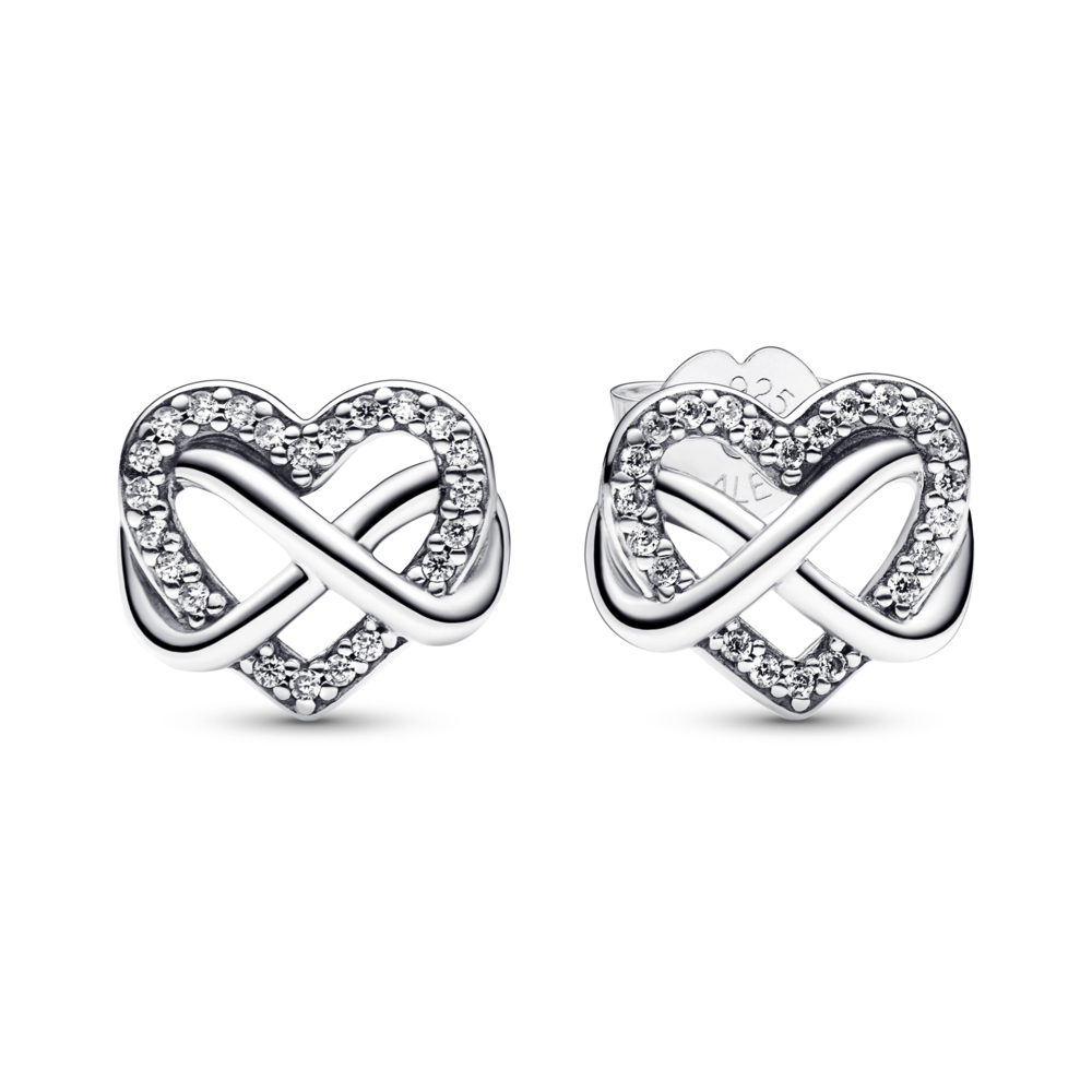 The ultimate symbol of eternal love. These sparkling sterling silver stud earrings feature an openwork heart motif set with sparkling cubic zirconia. An asymmetric infinity sign is entwined around the heart, creating a three-dimensional look.