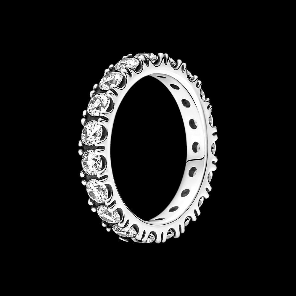 Pandora sparkling row eternity ring 190050C01-54. Make a classic statement with the Sparkling Row Eternity Ring. Hand-finished in sterling silver, this eternity ring features a band inlaid with sparkling clear man-made cubic zirconia. The design looks equally beautiful worn solo or stacked with other rings. Style it with bands in similar tones to create a monochromatic look, or go for contrasting metals for a combination that pops.
