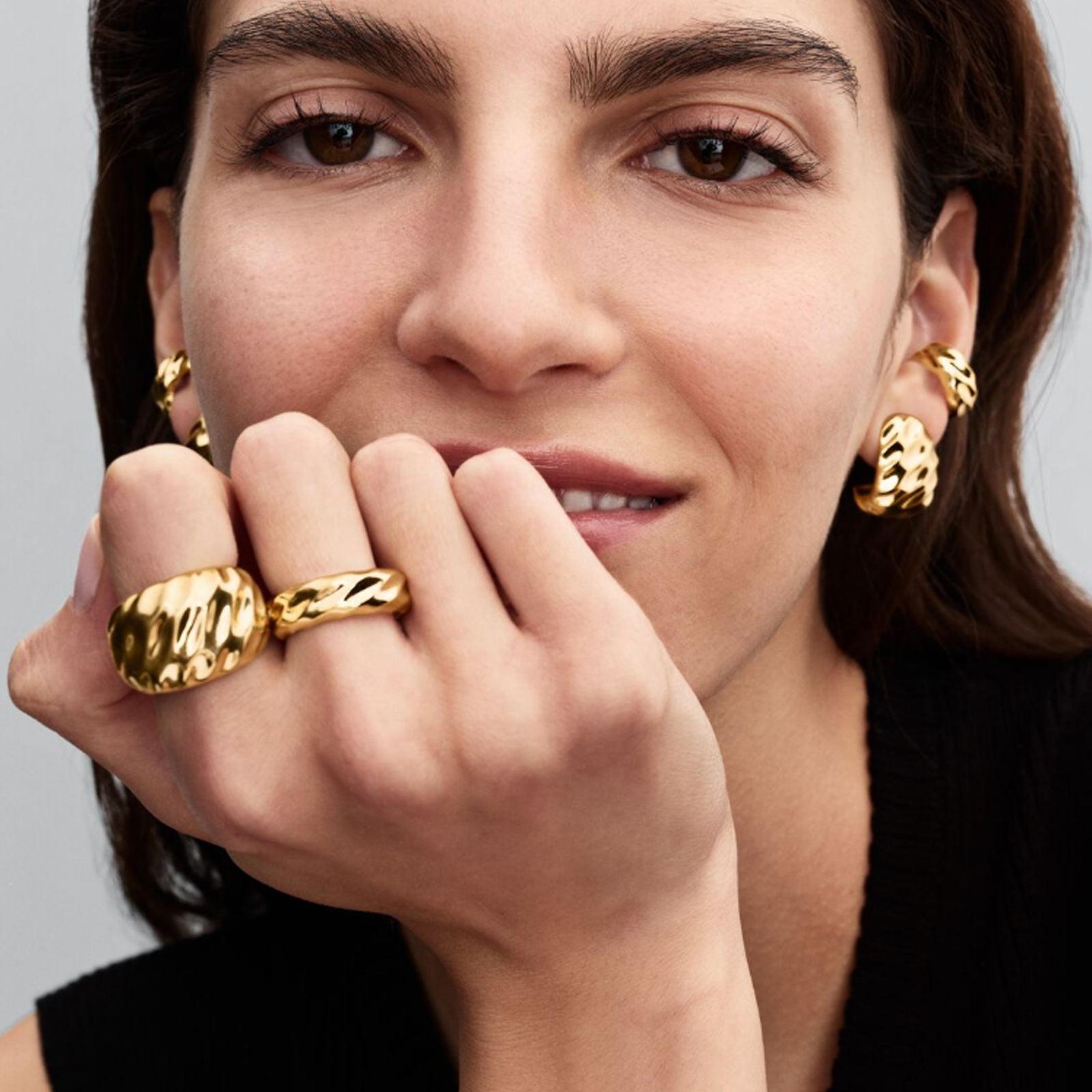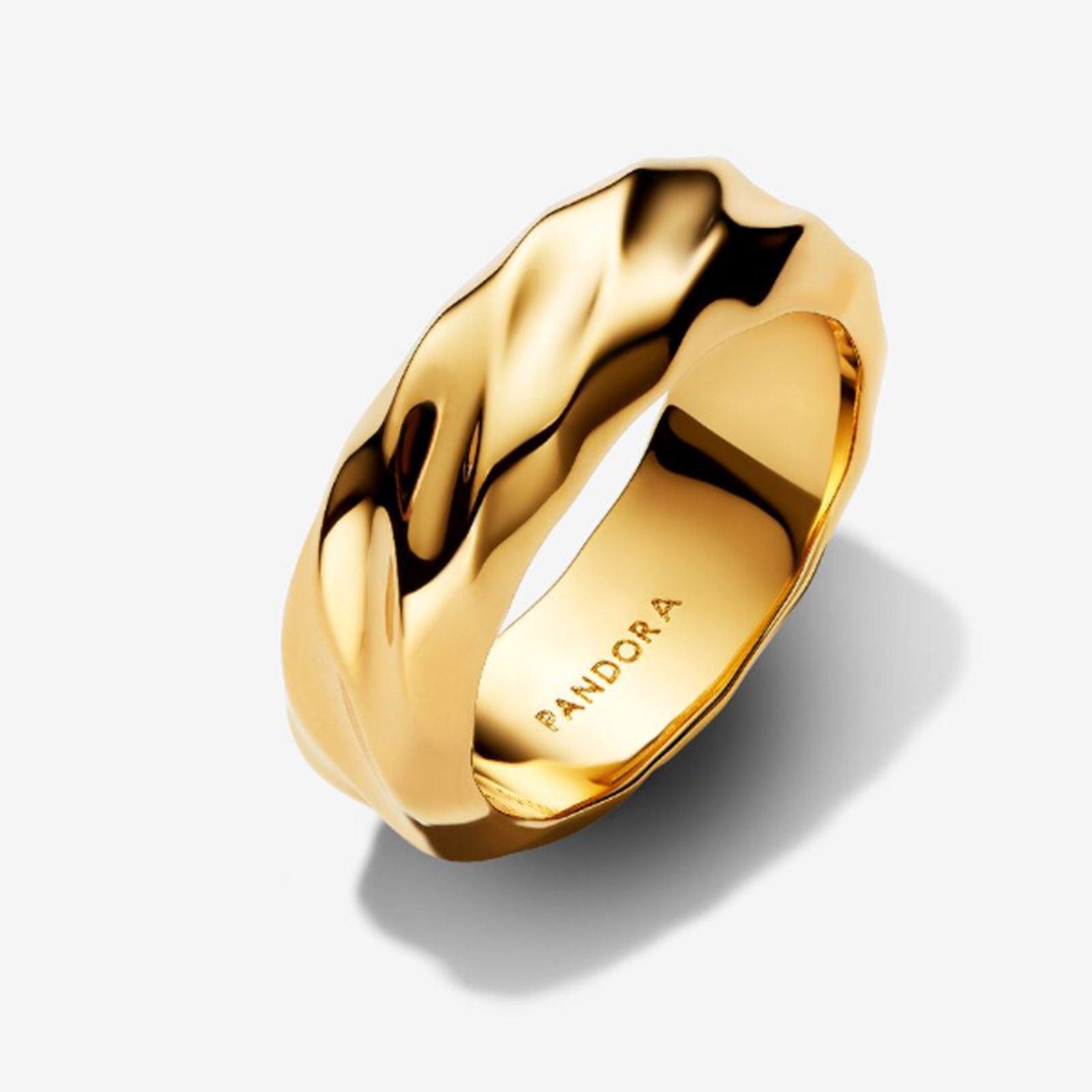 Rippled Wide Band Ring - Size 50. Celebrate individuality with a ring hat dares to be different. Its unique rippled design pattern is inspired by the beauty of imperfection, symbolizing the freedom to express yourself authentically.||? Gold Rippled Wide Band Ring, Size 50.|? From the collection Pandora Essence.|? Genuine Pandora Rings.|? Handcrafted by artisans using their unique 14kt gold metal blend.|? Showcases an organically shaped band with a ripple effect.|? Features a wavy design celebrating authentic beauty.|? The ring size is UK: K+ / EU:50.|