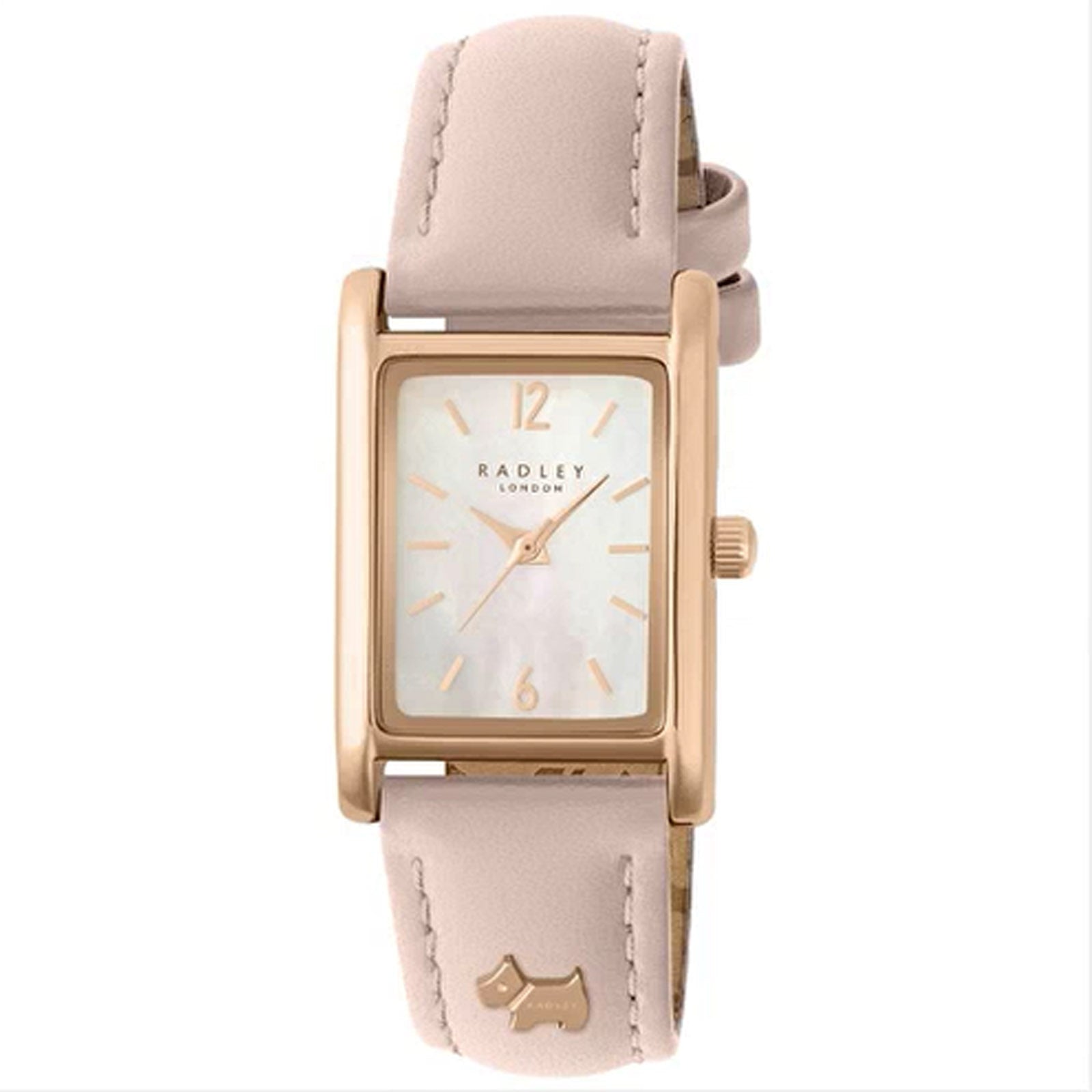 Radley RY21724. Rectangle mother of pearl dial with baton and Arabic numeral markers. 21mm rose gold plated case on pale pink leather strap. With a 16mm wide pale pink leather strap and Radley dog stud, this rose tone ladies watch from Radley is perfect for the fashionable woman. 30m water resistant.
