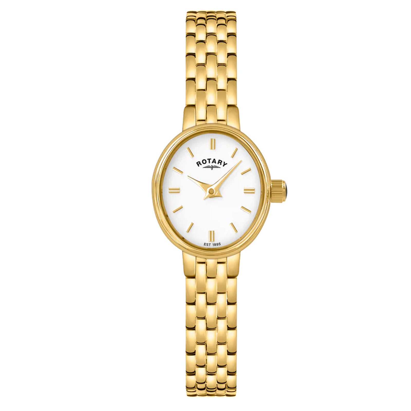 This Rotary Cocktail is a refined ladies timepiece that combines timeless design with modern functionality. Featuring a gold PVD stainless steel case and matching bracelet, this watch exudes elegance and sophistication, making it a perfect accessory for any occasion.  Its oval champagne dial is complemented by slim gold-tone hour markers and 2 dauphine hands, offering a minimal yet classic appearance. Powered by a highly reliable quartz movement, it ensures accurate and dependable timekeeping. With a water resistance of 70m, this watch is as practical as it is beautiful, suitable for daily wear and light water activities. The Rotary Cocktail is a versatile and elegant choice for those who value both form and function. Movement: Quartz Band: Bracelet Glass: Sapphire WR: 70 m Case Colour: Gold Case Diameter: 18 mm Case Height: 6.3 mm Feature: Slim Profile Dial: White