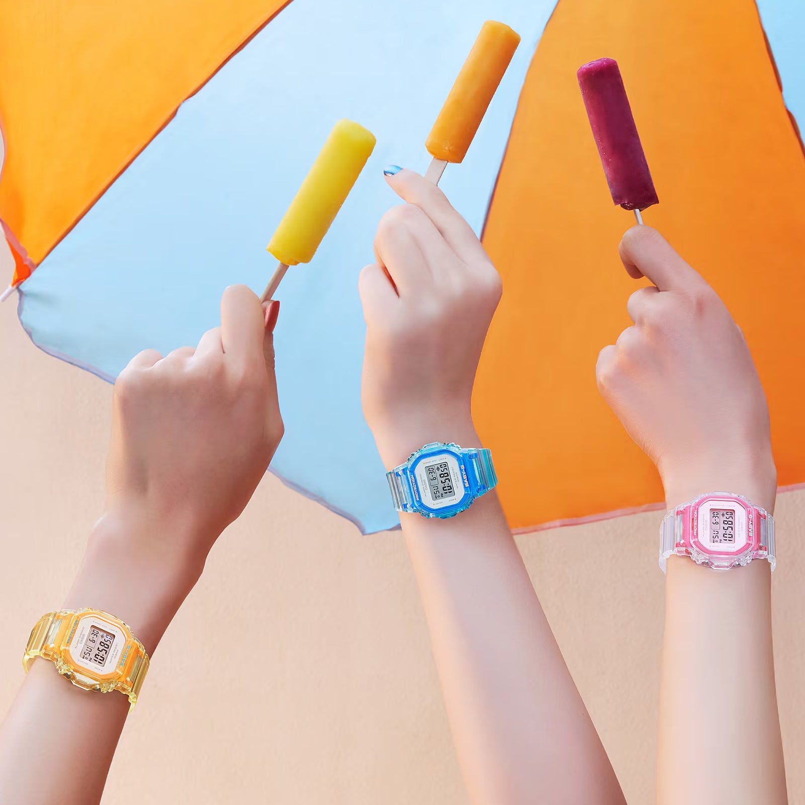 The iconic shape of this light blue Baby-G now comes in brand new colours and material. The playful see through design combines a tinted resin case with external parts in clear resin for a new refreshing look. Basic Information Case size (L× W× H) 42.1 × 37.9 × 11.3 mm Weight 30 g Case and bezel material Resin Band Resin Band Construction Shock Resistant Water resistance 100-metre water resistance Power supply and battery life Approx. battery life: 3 years on CR1616 Country of origin Thailand Exterior Glass Mineral Glass Compatible band size 125 to 180 mm Watch Features Stopwatch 1/100-second stopwatch Measuring capacity: 00'00''00 to 59'59''99 (for the first 60 minutes) 1:00'00 to 23:59'59 (after 60 minutes) Measuring unit: 1/100 second (for the first 60 minutes) 1 second (after 60 minutes) Measuring modes: Elapsed time, split time, 1st-2nd place times Timer Countdown timer Measuring unit: 1 second Countdown range: 24 hours Countdown start time setting range: 1 second to 24 hours (1-second increments, 1-minute increments and 1-hour increments) Other: Auto-repeat Alarm/hourly time signal Multi-function alarm Hourly time signal Flash alert feature Flash alert Flashes with buzzer that sounds for alarms, hourly time signals, countdown timer time up alarm Light LED backlight (Super Illuminator) Afterglow Light colour LED: White Calendar Full auto-calendar (to year 2099) Accuracy: ±15 seconds per month Other features 12/24-hour format Regular timekeeping: Hour, minute, second, pm, month, date, day.