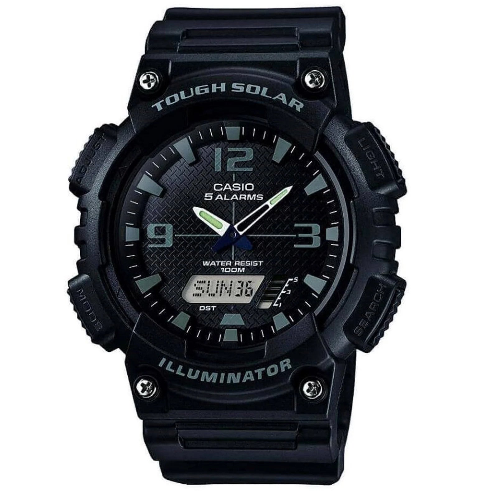 Casio dual display AQ-S810W-1A2VEF. This CASIO timepiece is powered by Tough Solar and features 2 countdown timers, a stopwatch, 5 alarms and world time mode. The watch is housed in a black durable resin case with matching strap and is 100M water resistant. Water Resistant 100 Metres Water Resistant. Accuracy +/- 30 seconds per month. Alarm Function 5 Daily Alarms: Each will sound every day at the time you set, Hourly time signal: The watch beeps every hour on the hour. Auto Calendar Once set, the automatic calendar always displays the correct date. Band Material Resin. Battery Level Indicator An indicator shows the current battery charge level. Battery Life Approximately 10 months on full charge (without further exposure to light), 23 months on rechargeable battery (operation period when stored in total darkness with the power save function on after full charge). Countdown Timer Function Countdown Range: 100 hours, Measuring Unit: 1 second, 2 Countdown Timers. Date and Weekday Display The current date and week day are displayed on the watch face. Date Display The current date is displayed on the watch face. Dimensions 52.2 x46.6 x 13.8 mm. Display Illumination LED light, Selectable illumination duration (1.5 seconds or 3 seconds), With afterglow. Multi Language Display Select from a number of different languages . Mute Function The button tones on the mode button can be switched off for discreet operation. Pre-set alarm or timer functions remain active.. Neobrite A luminous coating on the watch hands provides illumination in the dark.. Power Saving After the Alert: The following operations are stopped to save power: all hand movement (excluding the day indicator), Bluetooth connection, if applicable, and alarms. Resin Glass Resistance against breaking. Solar Power A high-capacity solar-charging system harnesses the power of any light source for reliable watch operation with minimal impact to the environment. Stopwatch Function Measuring Capacity: 24 hours, Measuring Modes: Elapsed time, split time, Measuring Unit: 1/100th second. World Time Displays the current time in major cities and specific areas around the world.