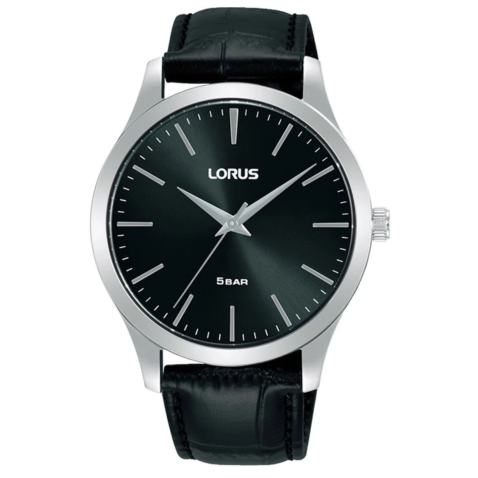 This timeless gents Lorus watch features a 40 x 10mm stainless steel case featuring a black dial with silver tone baton hour markers and hands. A black leather strap completes the look. Presented in a Lorus watch box. 50m water resistant. Dial Black sunray dial. Hands Hour, minute & second hands. Water Resistant 5 bar water resistant. Material Stainless steel case and snap case back. Band Black leather strap. Glass Flat mineral crystal. Case Size 40mm. Function Quartz