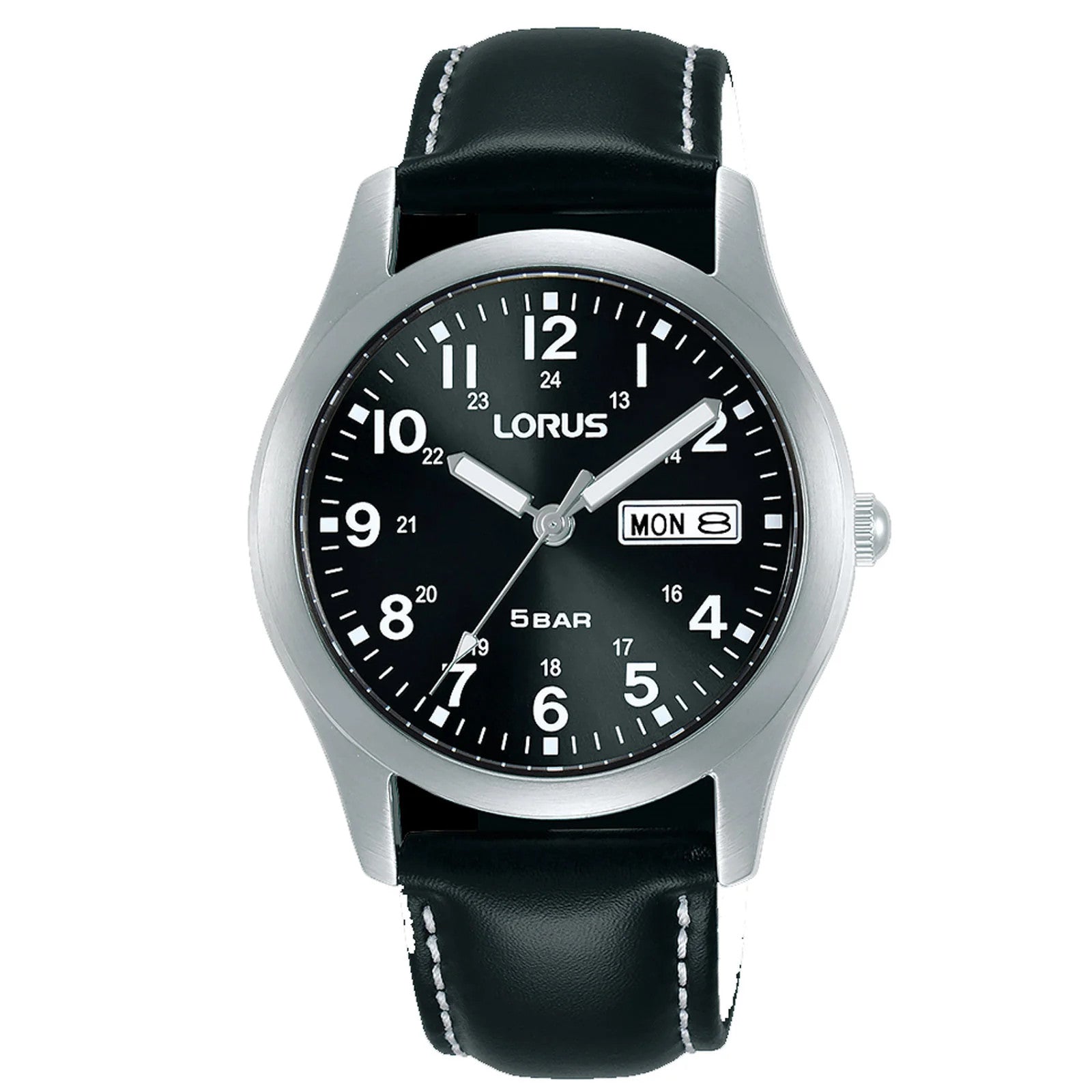 Practicality meets sophistication in this stylish watch. The black field-style sunray dial is enhanced by white clear numeral hour markers and 24-hour inner markers, with semi-luminous visibility in low light conditions. With watchmaking expertise from Seiko Watch Corporation, this quartz-powered watch has a day/date window at 3 oclock for added functionality, subtly incorporated into the design. With genuine leather black strap, stainless steel case and being water-resistant up to 50 metres, its both durable and elegant; the ideal timeless accessory for every day. Lorus: attractively affordable watches, made to last from Seiko Watch Corporation. Movement Accuracy:+/- 20 seconds a month Calibre: VX43 Movement Type: Quartz Dial Colour: Black Case Material: Stainless steel Strap/Bracelet: Leather strap Strap/Bracelet Width: 20mm Clasp/Buckle: Pin buckle Case Thickness: 8.7mm Case Diameter: 38mm Watch Length: 235mm Case Back: Screw case back Other Specifications Water Resistance: 5 bar Crystal Type: Flat mineral crystal Watch Hands: Hour, Minute & second hands Other Specifications: Day/date display Weight: 45g