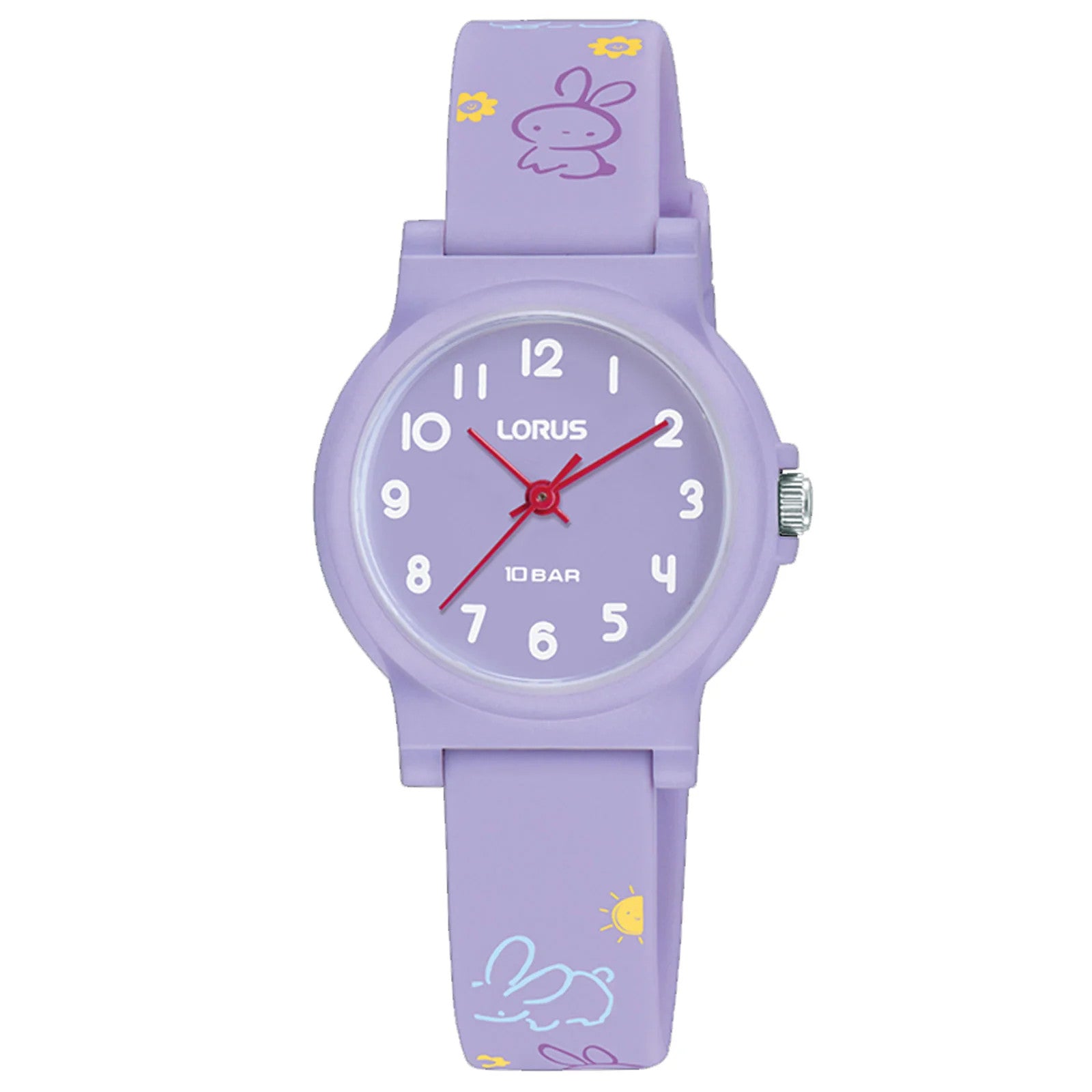 Dive into the day with this watch thats perfect for little animal lovers and future vets! With its sunshine and bunny theme, its perfect for outdoor adventures. This trusty watch features an analogue display, making time-telling simple and fun with its three hands and clear Arabic numerals. And you dont need to worry about those unexpected splashes and tumbles; this watch is water-resistant up to 100 metres and this together with the protected crown will keep it ticking at all times. Lorus: attractively affordable watches, made to last from Seiko Watch Corporation. ?áMovement Accuracy: +/- 30 seconds a month Calibre: Y121 Movement Type: Quartz Dial Colour: Purple Case Material: Plastic, Plastic bezel Strap/Bracelet: Silicone strap Strap/Bracelet Width: 17.7mm Clasp/Buckle: Pin buckle Case Thickness: 10mm Case Back: 4 screw stainless steel case back Other Specifications Water Resistance:10 bar Crystal Type: Curved acrylic glass Watch Hands :Hour, Minute & second hands