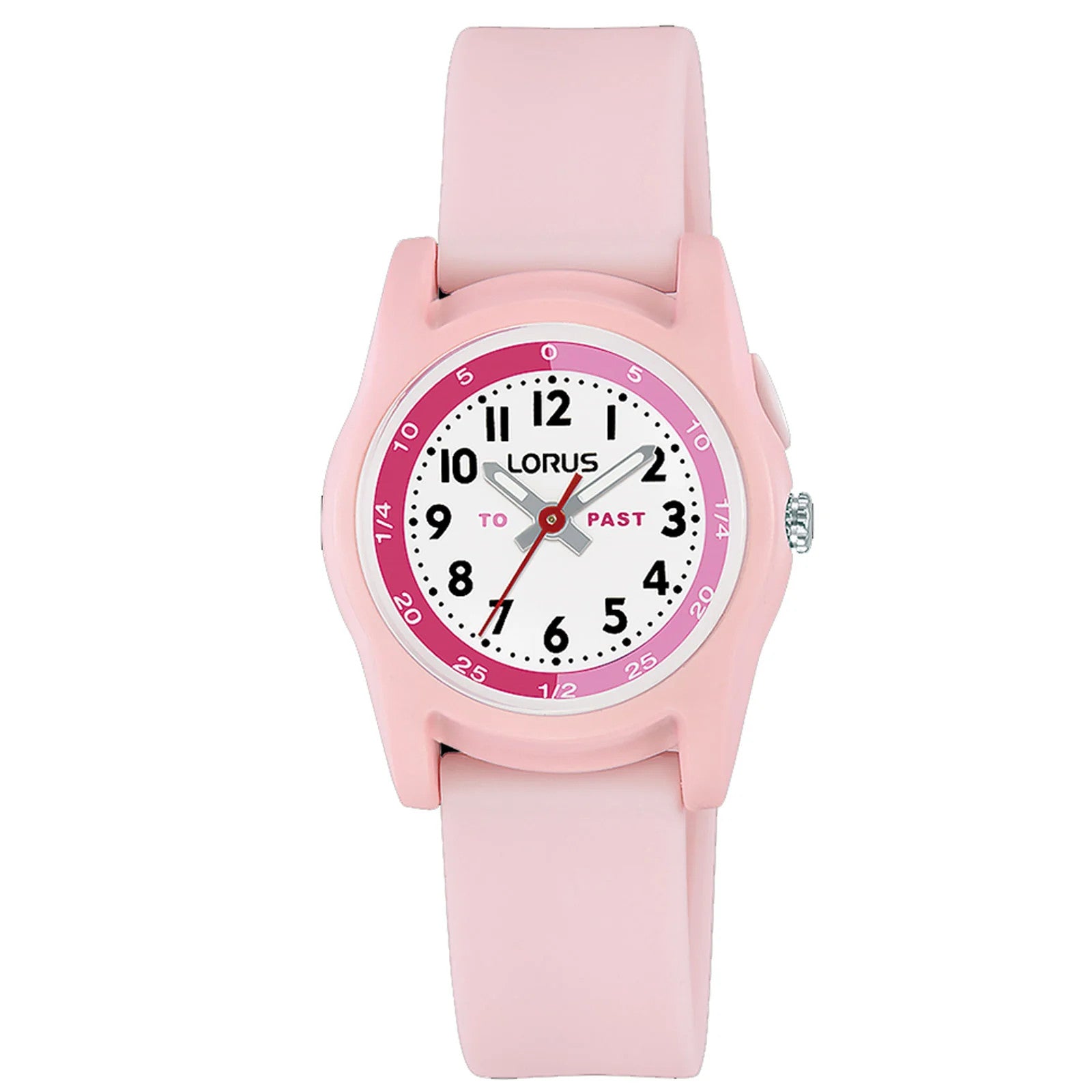 This watch is designed to make learning to tell the time easy, combining educational value with classic looks and durability. The clear hour marker numerals on the white dial with a magenta/lighter pink outer ring showing minutes and the to/past on the left and right sides of the dial respectively have been carefully designed to make time-telling straightforward. With watchmaking expertise from Seiko Watch Corporation, this quartz-powered watch is ideal for continuous wear in school or hobby settings. The 100m water resistance and comfortable polyurethane strap means itÔÇÖs suitable for swimming lessons, their first triathlon or washing hands before mealtimes. Designed for comfort and durability, it fits 135-180mm wrists comfortably ÔÇô with its robust construction and uncomplicated design, itÔÇÖs an excellent first watch for young learners. Lorus: attractively affordable watches, made to last from Seiko Watch Corporation. ?áMovement Accuracy: +/- 30 seconds a month Calibre: Z011?á Movement Type: Quartz?á Dial Colour: White?á?á Case Material: Plastic?á Strap/Bracelet: Polyurethane strap Strap/Bracelet Width: 14mm?á Clasp/Buckle: Pin buckle?á Case Thickness: 12mm Case Diameter: 28mm?á Watch Length: 200mm Case Back: 4 screw stainless steel case back Other Specifications Water Resistance: 10 bar Crystal Type: Curved acrylic glass Watch Hands: Hour, Minute & second hands Watch Function: Backlight Weight: 20g