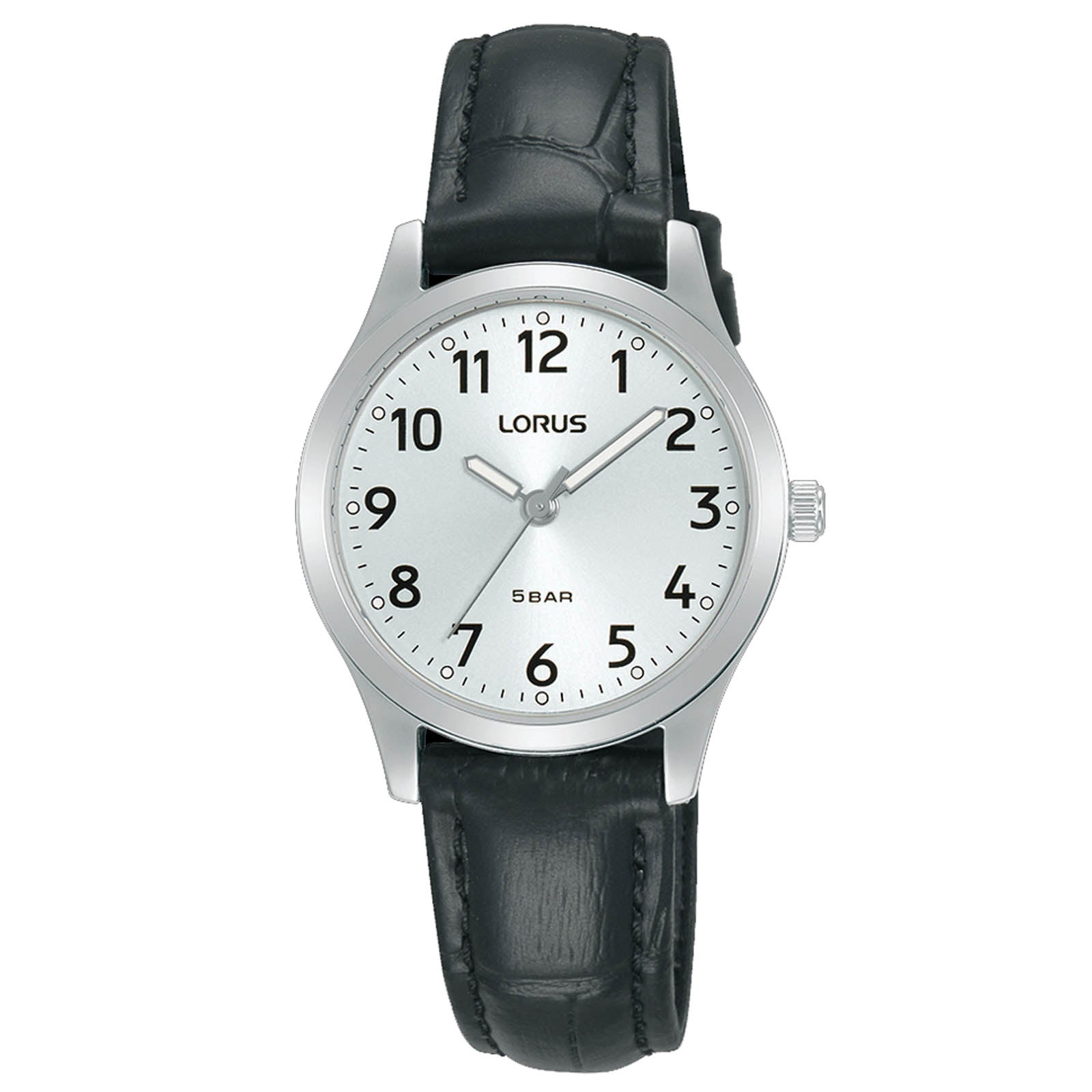 Designed for subtle elegance, this traditional watch features a soft silver-coloured dial that showcases a subtle sunray effect. The stainless steel case and black leather strap ensure durability whilst the lumibrite-coated hour hands and markers are visible even in low light. With watchmaking expertise from Seiko Watch Corporation, this quartz watch is water-resistant up to 50 metres, combining practicality with style, making it suitable for everyday wear and standout occasions alike. Lorus: attractively affordable watches, made to last from Seiko Watch Corporation. Specifications Movement Accuracy: +/- 30 seconds a month Calibre: Y121 Movement Type: Quartz Exterior Dial Colour: White Case Material: Stainless steel Strap/Bracelet: Leather strap Strap/Bracelet Width:14mm Clasp/Buckle: Pin buckle Case Thickness: 7.5mm Watch Length: 205mm Case Back: Snap case back Other Specifications Water Resistance: 5 bar Crystal Type: Flat mineral crystal Watch Hands: Hour, Minute & second hands Weight: 23g