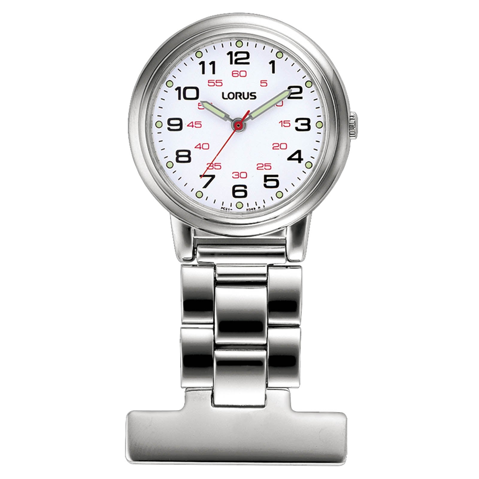 Fast and functional timekeeping, with this nurse’s fob pin from Lorus. With watchmaking expertise from Seiko Watch Corporation, this quartz-powered timepiece was specifically created for healthcare professionals but is suitable for all needing a wearable and convenient timepiece. The semi-luminous hour markers and hands on the white dial add to the practicality of this functional design with readability even in dim light, without the need to turn on a backlight. The robust stainless steel case ensures resilience in active work environments. It has a metal brooch pin attachment for security. Hands-free, water-resistant and easy to read, it is a practical and reliable timekeeper, ideal for those who appreciate functionality in their essential work tools. Lorus: attractively affordable watches, made to last from Seiko Watch Corporation. Specifications Movement Accuracy: +/- 30 seconds a month Calibre: PC21 Movement Type: Quartz Exterior Dial Colour: White Case Material: Zinc Strap/Bracelet: Stainless steel bracelet Strap/Bracelet Width: 12mm Clasp/Buckle: Special buckle Case Thickness: 7.73mm Case Diameter: 30mm Watch Length: 60mm Case Back: Stainless steel case back Other Specifications Water Resistance: 3 bar Crystal Type: Flat mineral crystal Watch Hands: Hour, Minute & second hands Weight: 25g