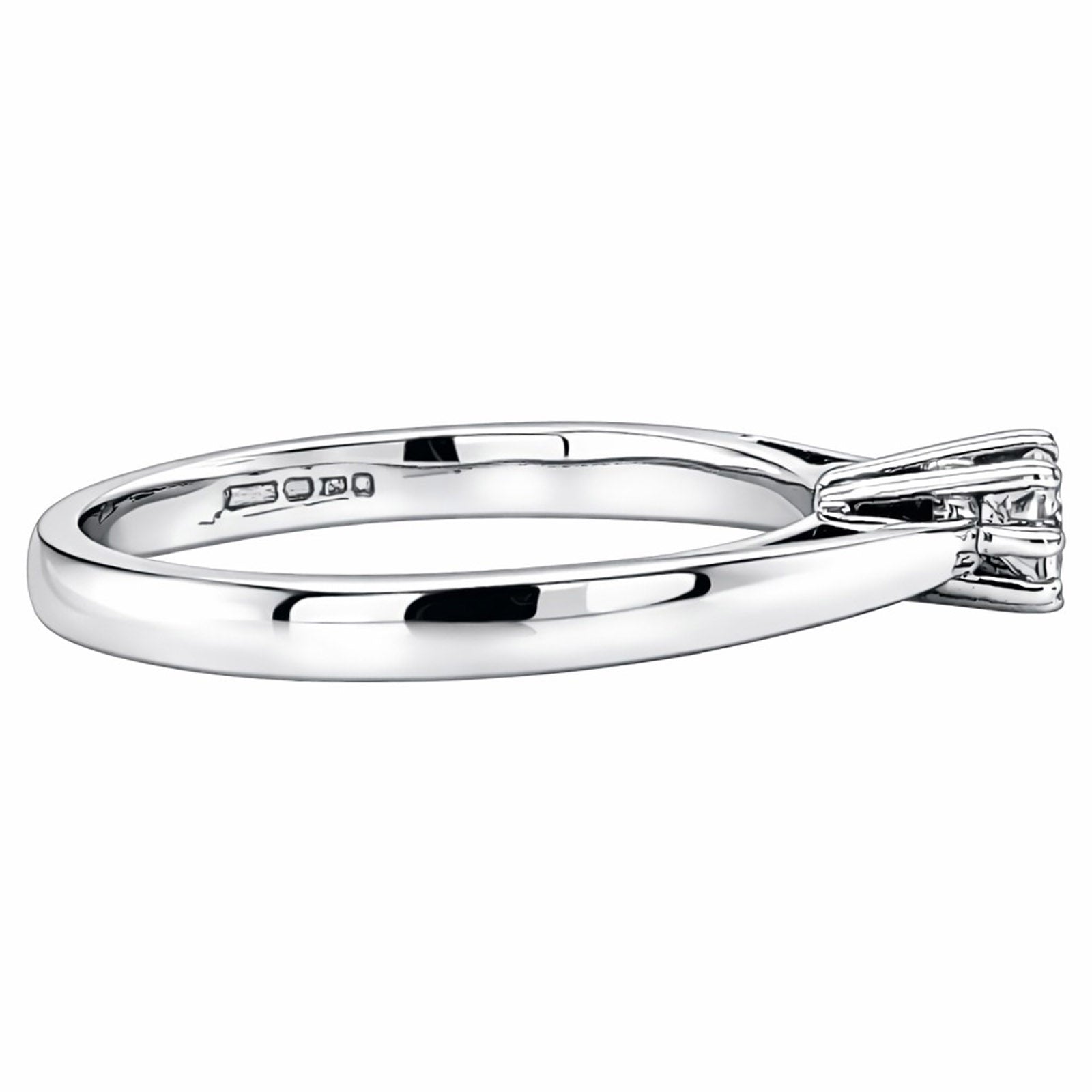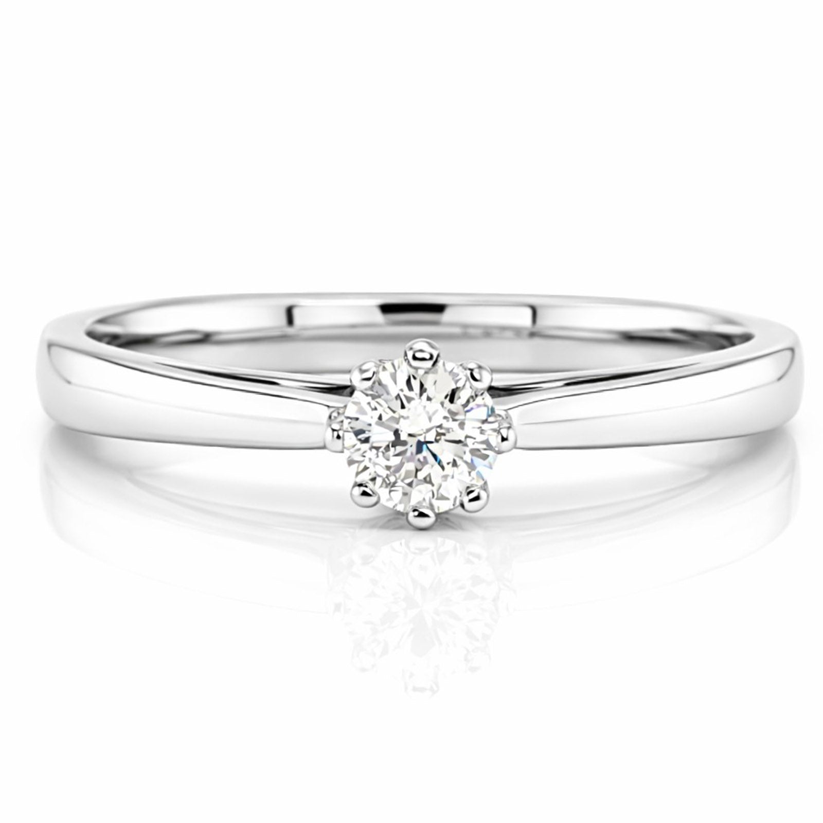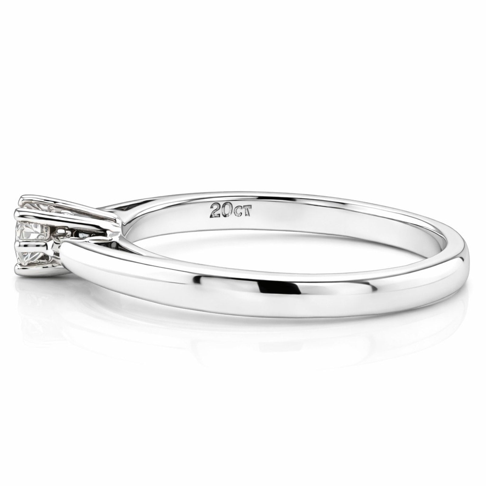 18ct white gold solitaire diamond ring. The diamond features a round brilliant cut diamond that is set in an 8 claw high setting. Diamond 0.20ct. Metal: 18ct White gold Diamond weight: 0.20ct Diamond quality: H colour, SI2 clarity Ring Size: O