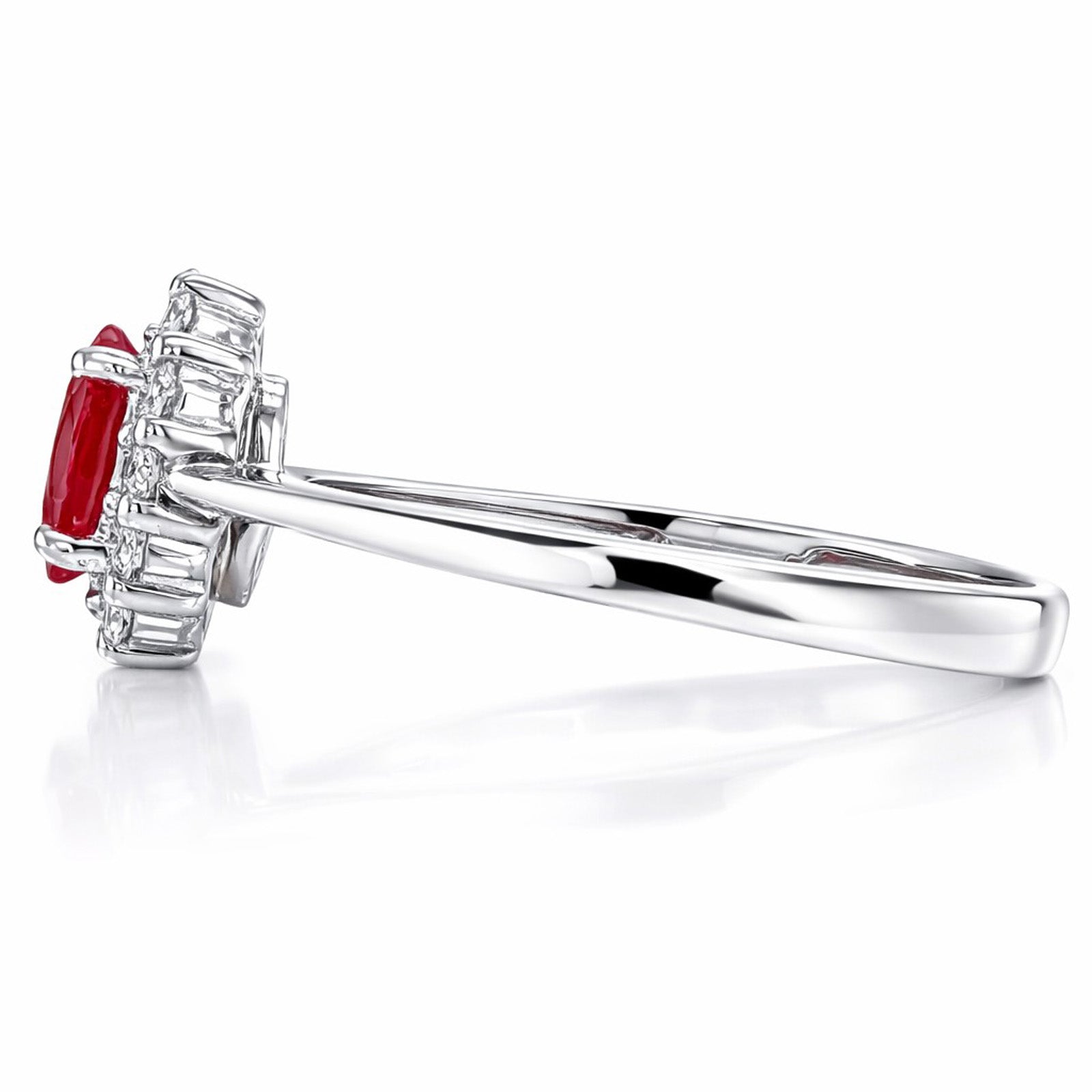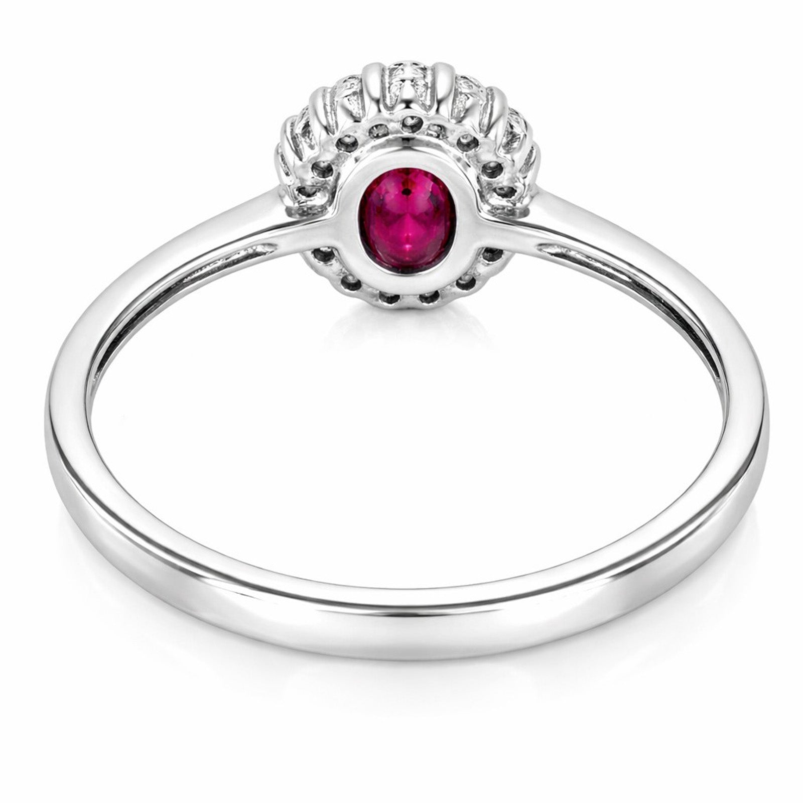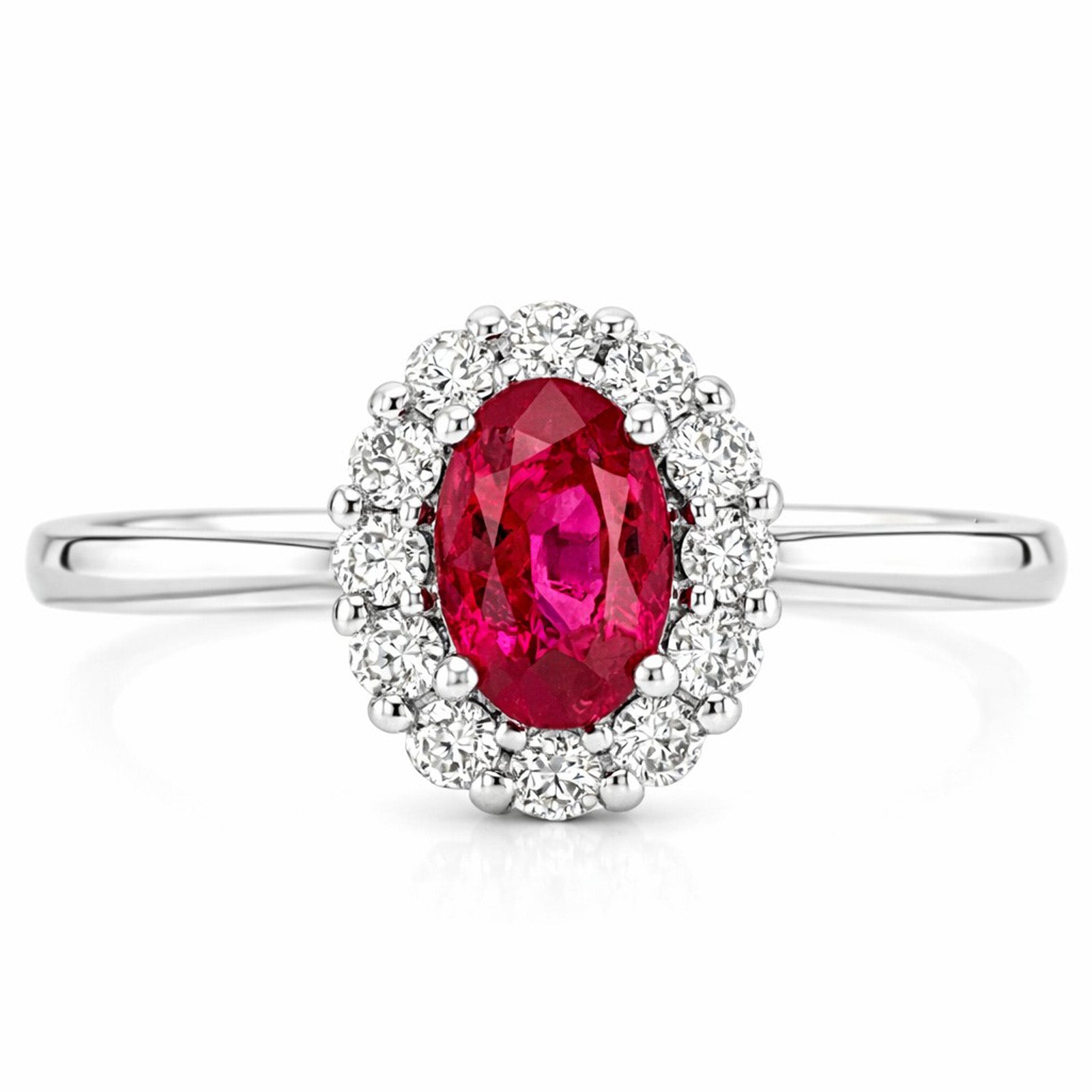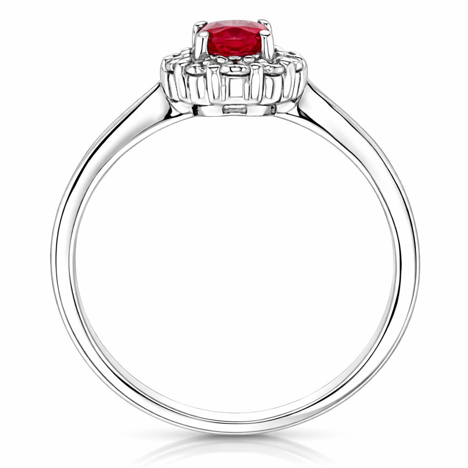 9ct white gold ruby and diamond oval cluster ring. This ring features an oval cut red ruby 0.54ct surrounded by a halo of round cut white diamonds 0.22ct secured in a 9ct white gold claw setting. Size N.