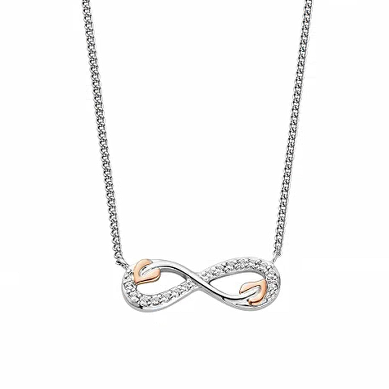 Clogau Tree Of Life Infinity Necklace 3STOL0735. A romantic interpretation of the infinity symbol, Clogau Tree of Life Infinity Silver Necklace features sweeping, sparkling curves of sterling silver and white topaz tipped with their signature leaf motif, signifying a love that will continue to grow for eternity. Width: 1.47cm. Height: 1.0cm. Chain length: 55cm - adjustable.