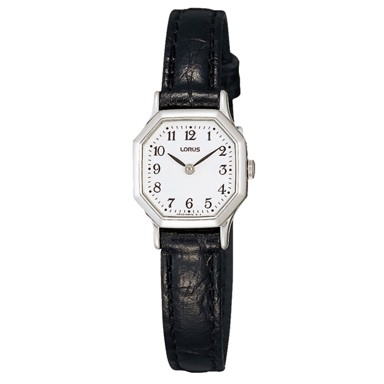Lorus Elegant Classic RJ471BX9. Octagonal white dial with arabic numeral markers. Silver tone case on a black leather strap and a quartz movement. Case Thickness: 6.5mm Case Diameter: 19mm Watch Length: 190mm