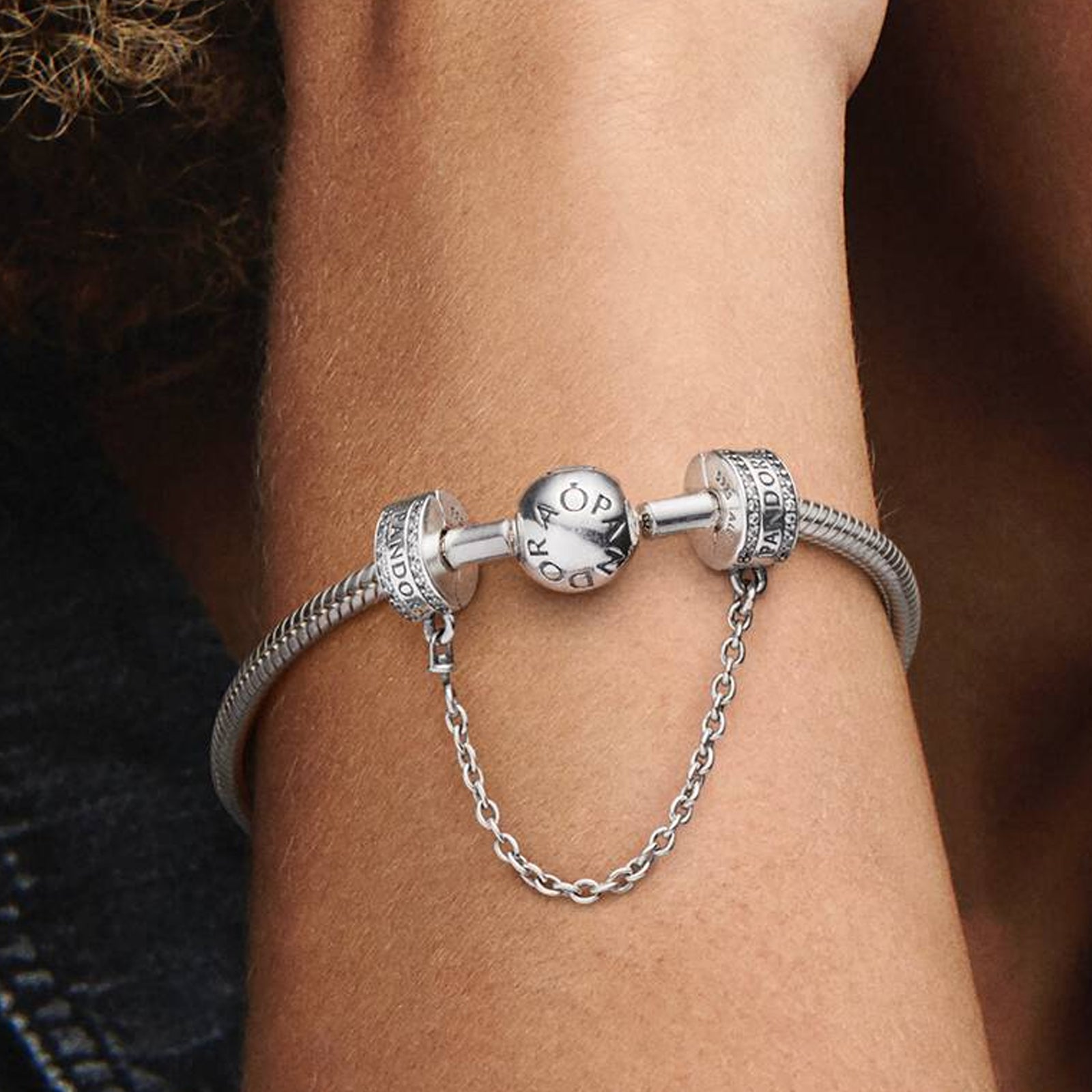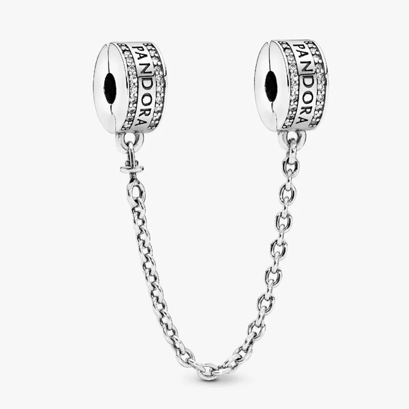 PANDORA logo silver safety chain with clear cubic zirconia and silicone