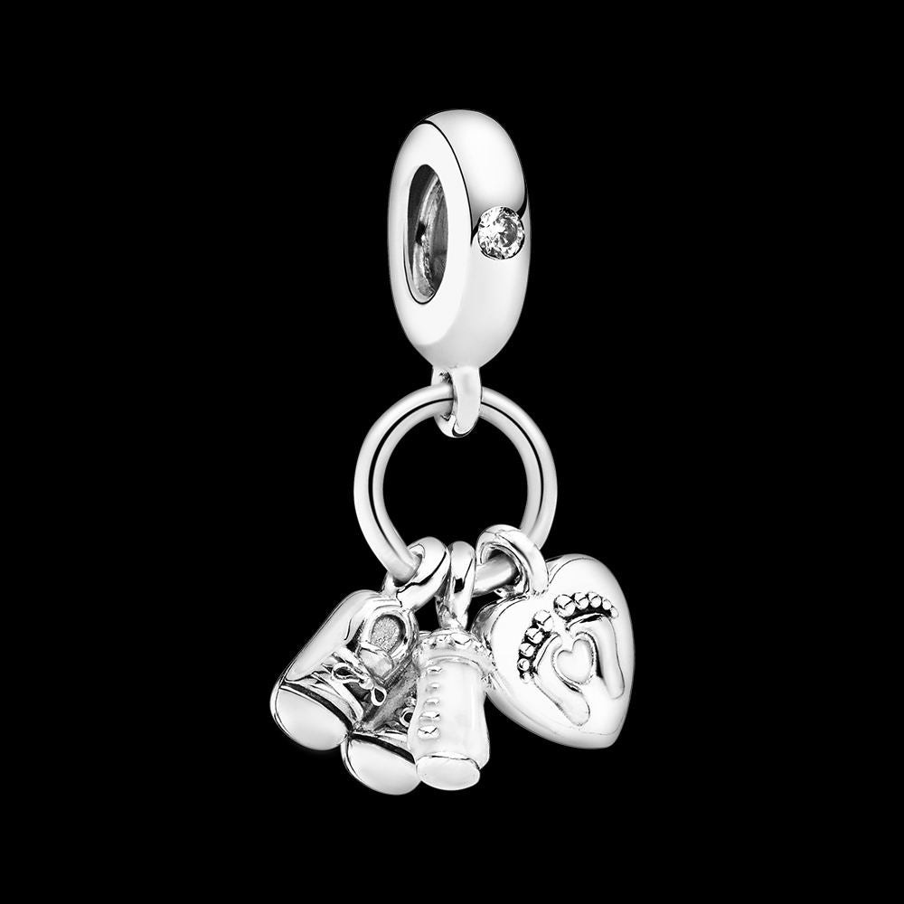 Shoes, baby bottle and heart silver dangle with clear cubic zirconia and white enamel