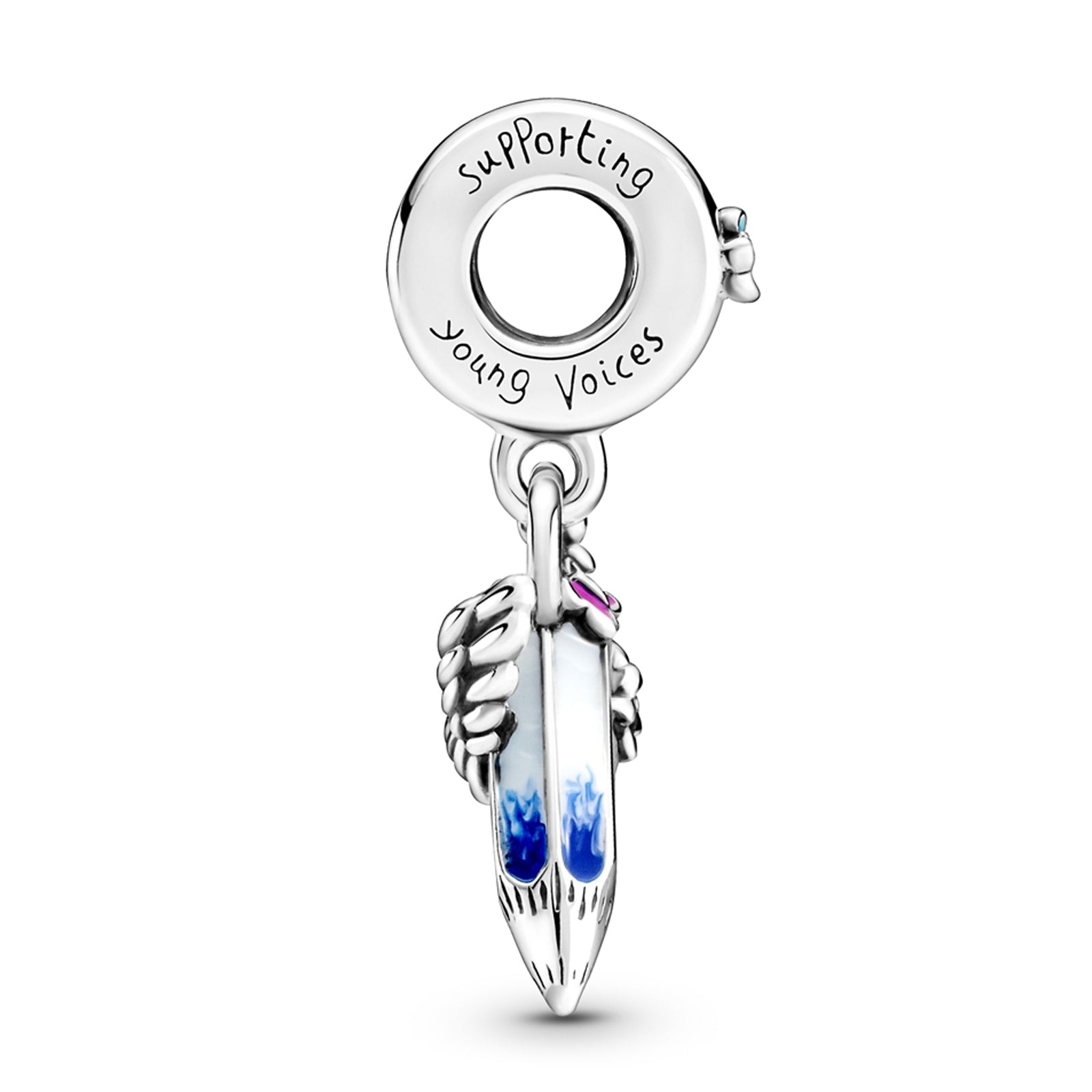 Crayon with butterflies and wings sterling silver dangle with blue, pink, yellow, white and green enamel. Made from sterling silver with colourful enamel. Support young voices. Limited run of the 2,632 Dreams of the Future Crayon dangle charm in the UK & Ireland. All children’s art contributions and descriptions were organized and solicited solely by Pandora through Pandora’s employees across the world.