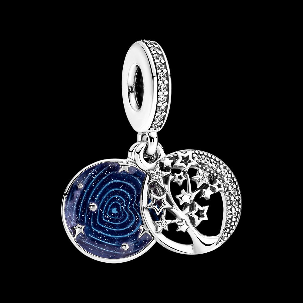 Star and moon family tree sterling silver dangle with clear cubic zirconia and blue glittery enamel