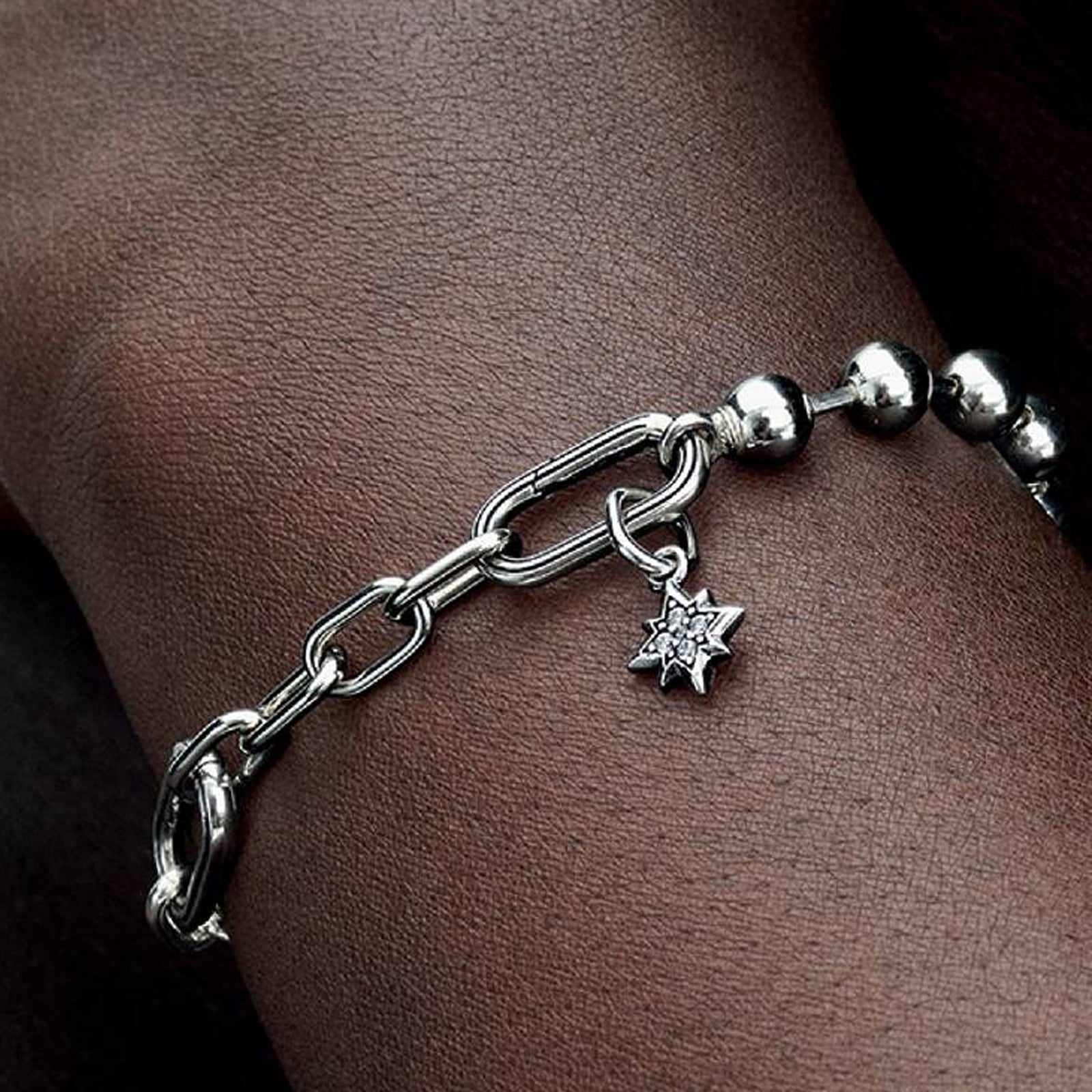 Pandora ME Star Mini Dangle Charm. Bring a dash of cosmic energy to your look. This sterling silver eight-point star features five sparkling stones and microbeads on one side, and a microbead pattern on the other. A symbol of renewal, dreams and a guiding light. Cubic zirconia. Flawless and full of flashes of colour, loved for its multi-faceted sparkle. Sterling silver. Our signature metal, loved for its cool, bright finish. Why you’ll love it. Ready to take on any meaning you or a loved one decides to give it. Hand-finished. To maintain our high quality standards keep it perfect by gently remove naturally occurring metal tarnish as soon as it starts with a soft cloth. Compatible with Pandora moments / Pandora ME. Dimensions 2.3mm deep, 10.9mm high, 8.5mm wide