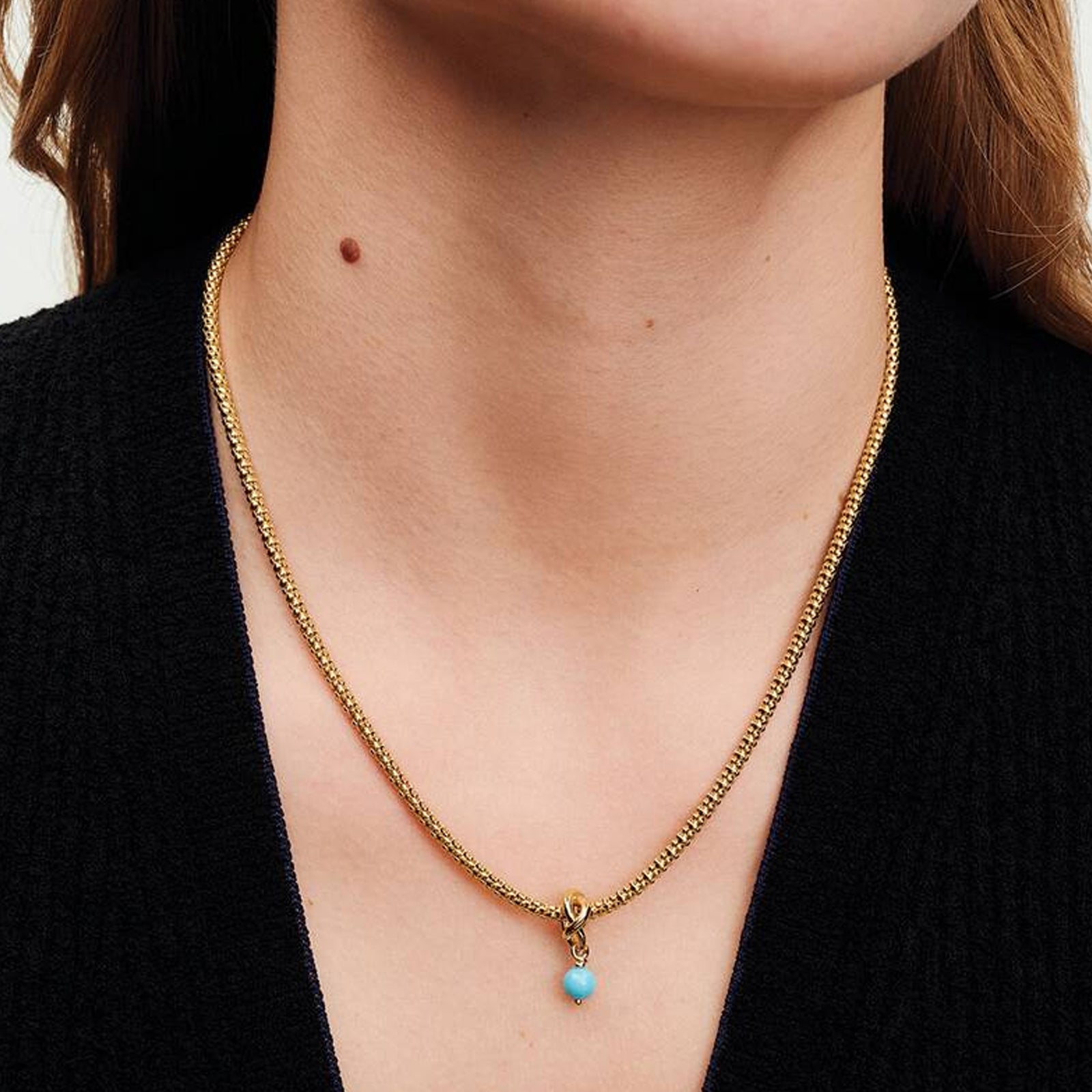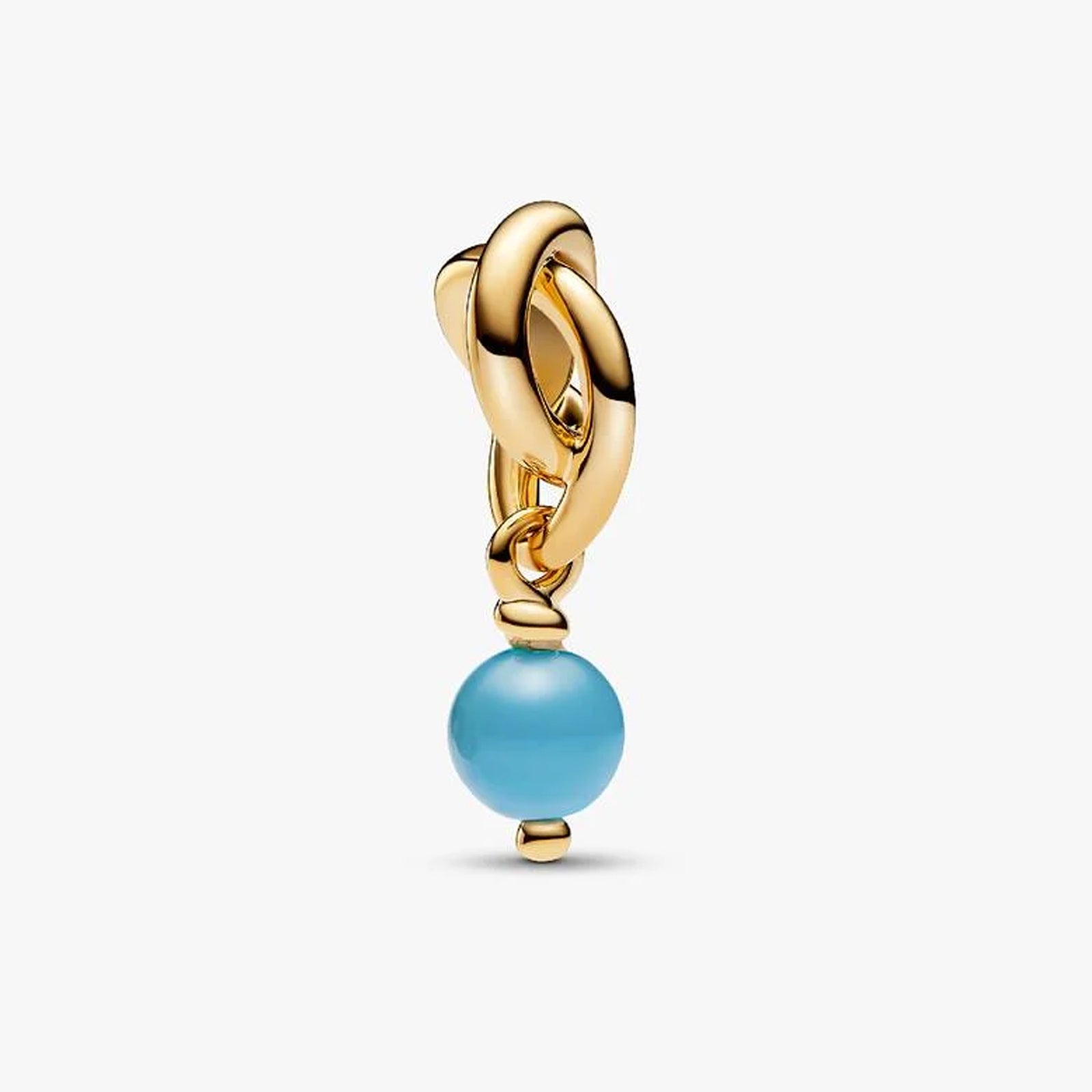 December Eternity Circle Dangle Charm. This 14k gold-plated dangle charm is made up of a triple knotted circle that resembles an infinity sign. Carrying a faceted capri blue man-made crystal, wear yours as a symbol of forever. Man-made crystal Created in a full spectrum of tones, every crystal is vibrant and durable. 14k gold plating. Warm golden glow, plated to last and paired with our unique metal blend core. Why you’ll love it. A colourful symbol of forever. Hand-finished. To maintain our high quality standards Keep it perfect by gently remove naturally occurring metal tarnish as soon as it starts with a soft cloth.  Compatible with Pandora moments. Dimensions 9.3mm deep, 19.2mm high, 5.7mm wide. Charm only.