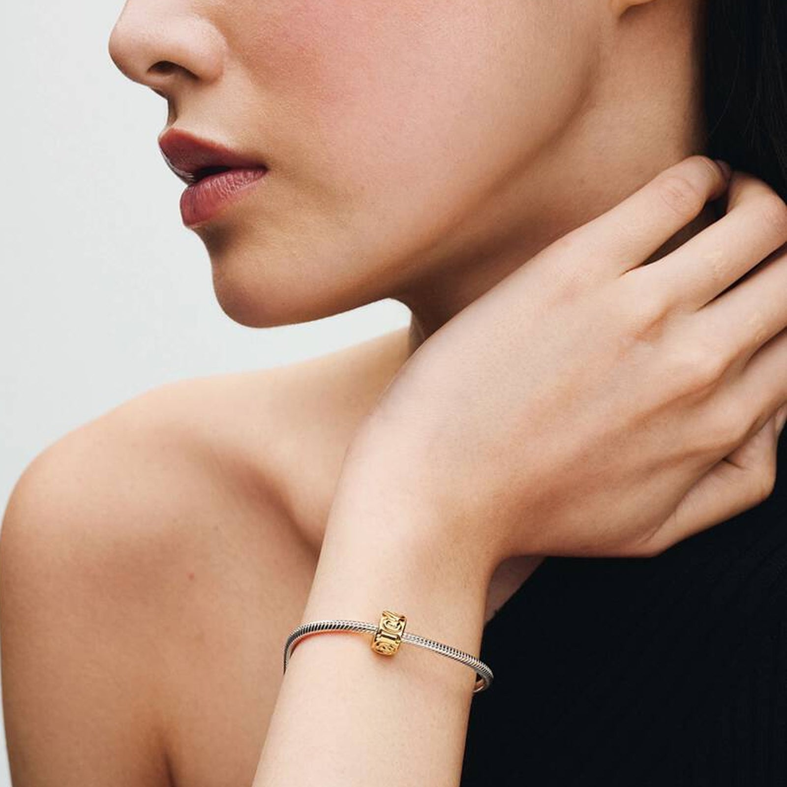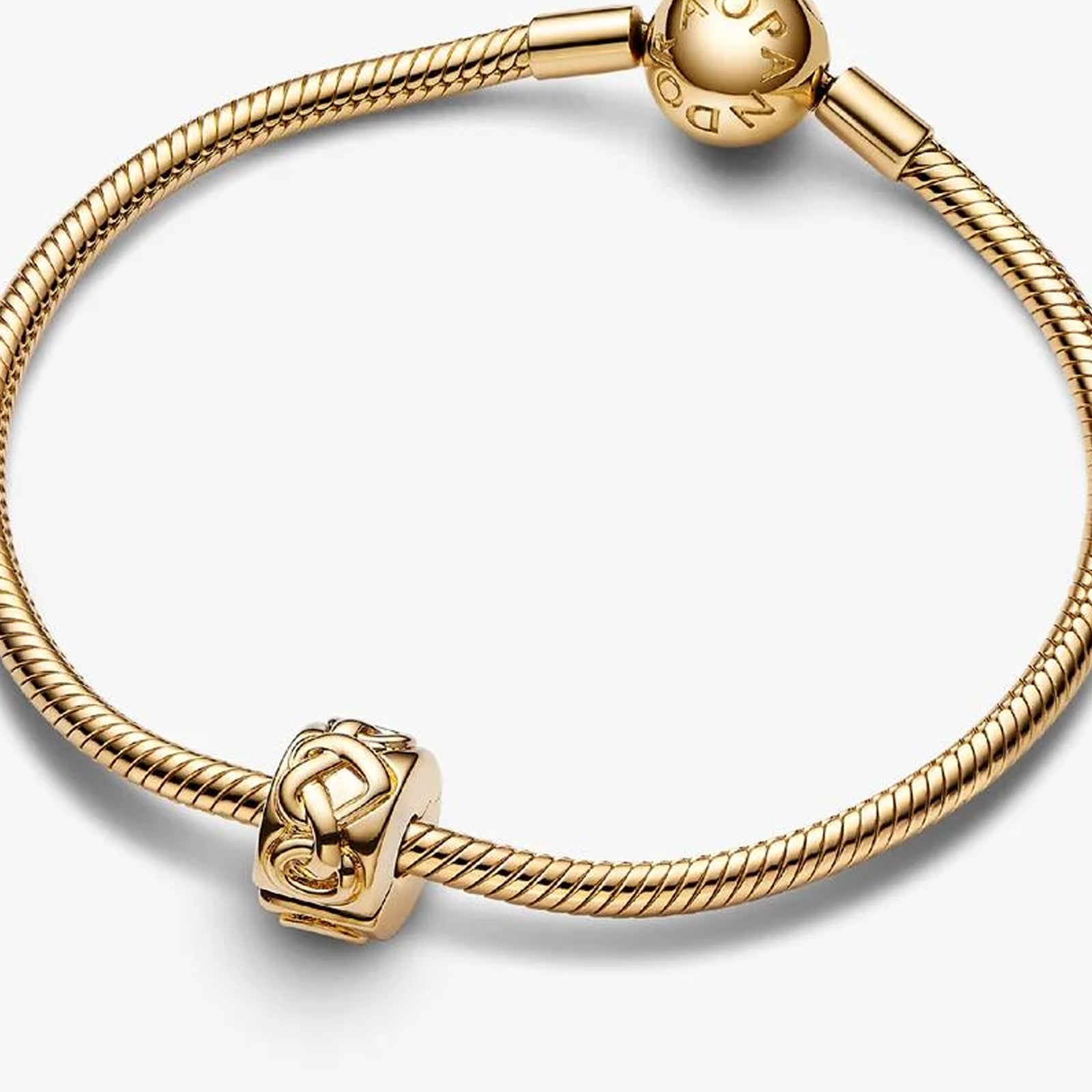 Our simple yet striking Pandora Moments clip charm is decorated with a row of knotted hearts. The design features a combination of the iconic heart and the classic love knot, which gives the piece extra emotional appeal. The 14k gold-plated charm is perfect for adding a heartfelt touch to your bracelet collection and helps to evenly space out your stack. This clip charm features no silicone grip, so it will slide if not styled onto threads (two raised charm dividers). 14k gold plating. Warm golden glow, plated to last and paired with our unique metal blend core. Why you’ll love it. Style it on your bracelet or necklace to space out your charms. Hand-finished. To maintain our high quality standards Keep it perfect by gently remove naturally occurring metal tarnish as soon as it starts with a soft cloth. Compatible with Pandora moments. Dimensions 10.8mm deep, 10.8mm high, 6.5mm wide. Clip charm only.