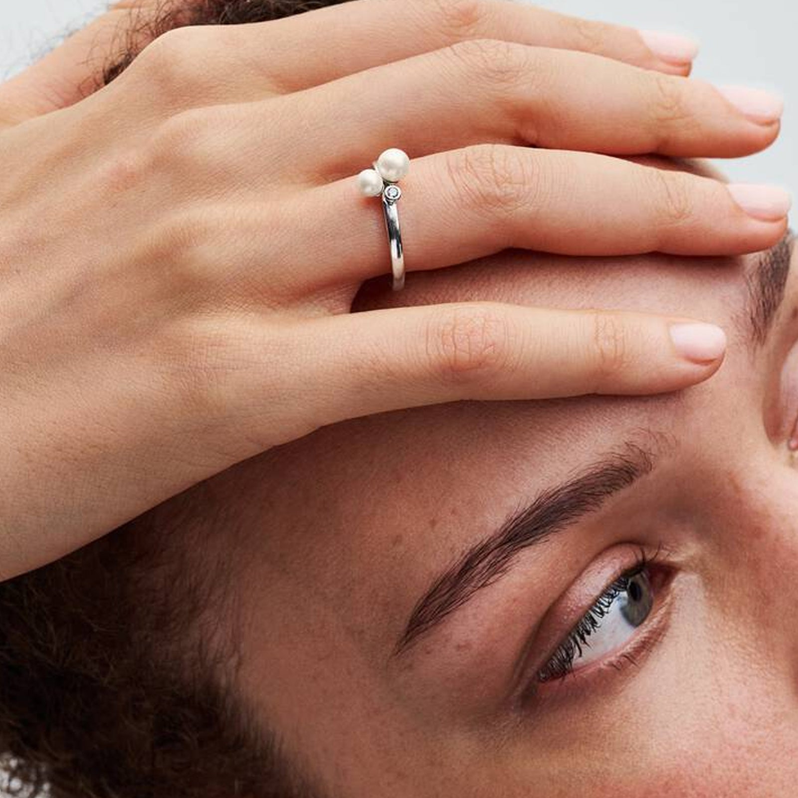 The slightly squared profile of the band showcases two treated freshwater cultured pearls and a clear cubic zirconia. This unique asymmetric design captures the essence of classic pearls, and symbolises beauty, wisdom, and love. Treated freshwater cultured pearl. Formed in nature, cultivated by artisans - every cultured pearl is unique. Cubic zirconia. Flawless and full of flashes of colour, loved for its multi-faceted sparkle. Sterling silver. Our signature metal, loved for its cool, bright finish. Why you’ll love it. Wear it as a symbol of your unique connection. Important information Each treated freshwater cultured pearl is unique and can vary slightly. Hand-finished. To maintain our high quality standards Keep it perfect by gently remove naturally occurring metal tarnish as soon as it starts with a soft cloth. Dimensions 7mm deep, 9mm high, 8.5mm wide