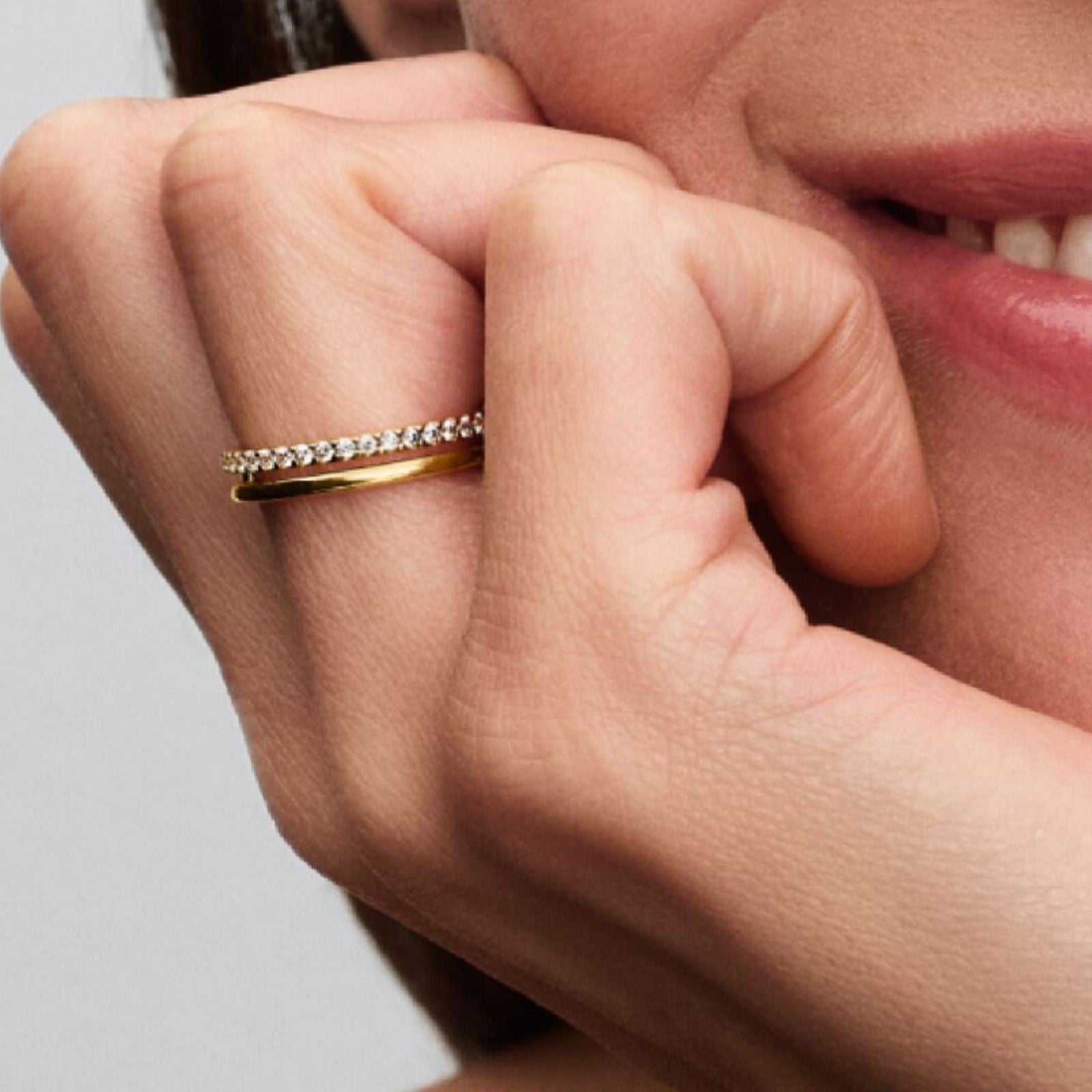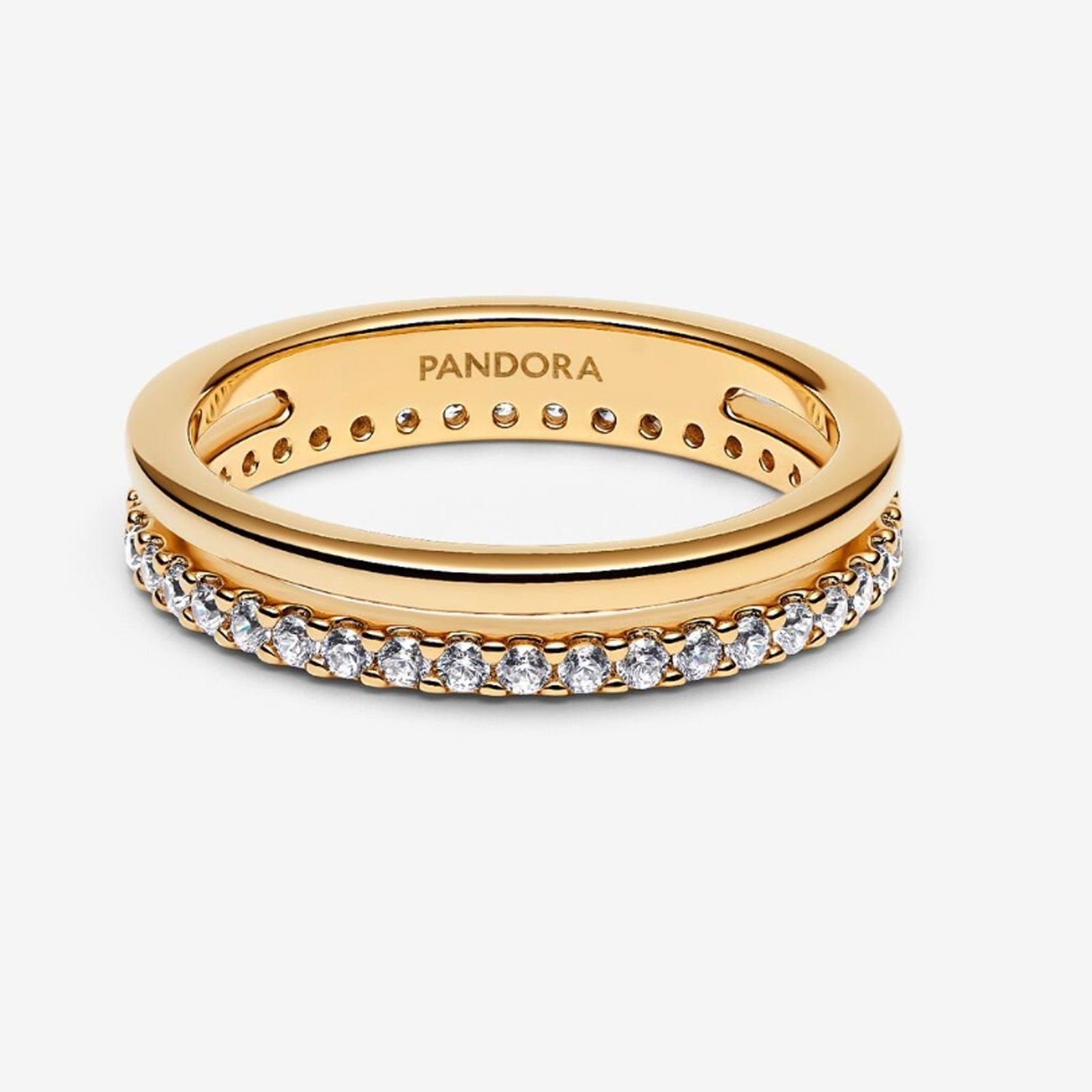 Gold Double Band Ring - 56. A bold yet delicate design, this connected double band pairs polished shine with pav? sparkle. A versatile piece that blends textures beautifully, making it a standout in any jewellery collection.||? Gold Double Band Ring, Size 56.|? From the collection Pandora Essence.|? Genuine Pandora Rings.|? Handcrafted by artisans using their unique 14kt gold metal blend.|? Showcases one polished band parallel to a second.|? Features full pave row of sparkling stones.|? This is a ring size: UK: P+ / EU: 56.|
