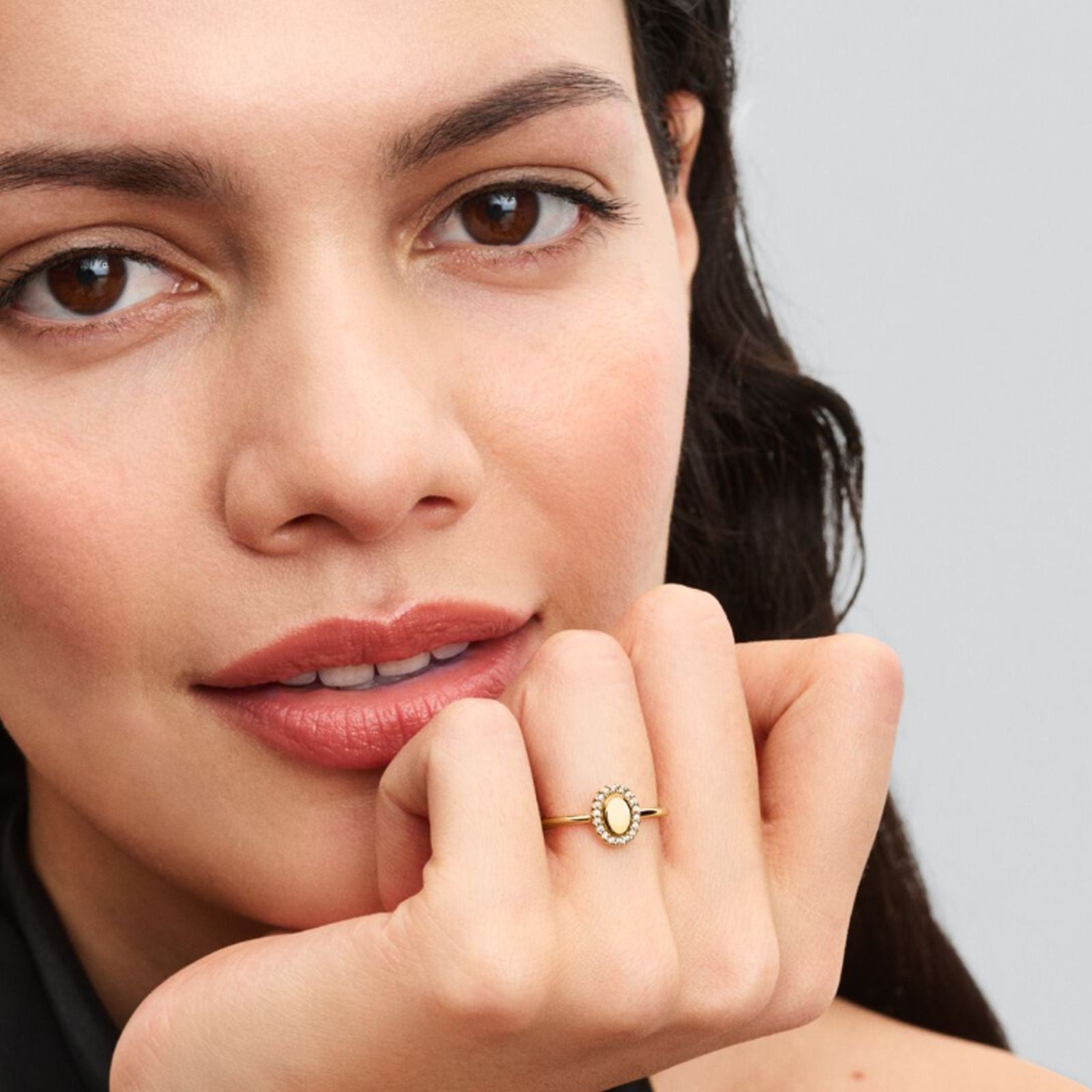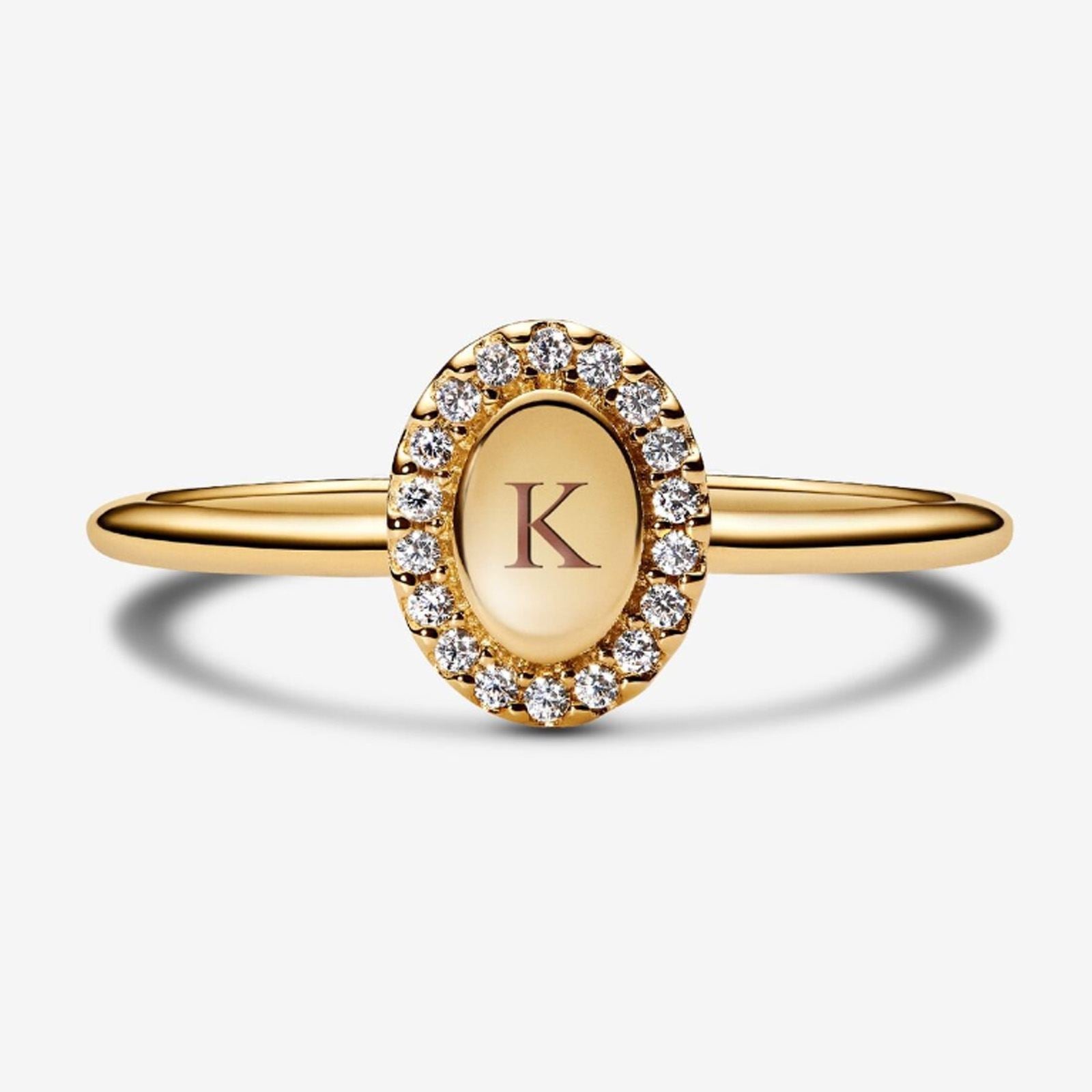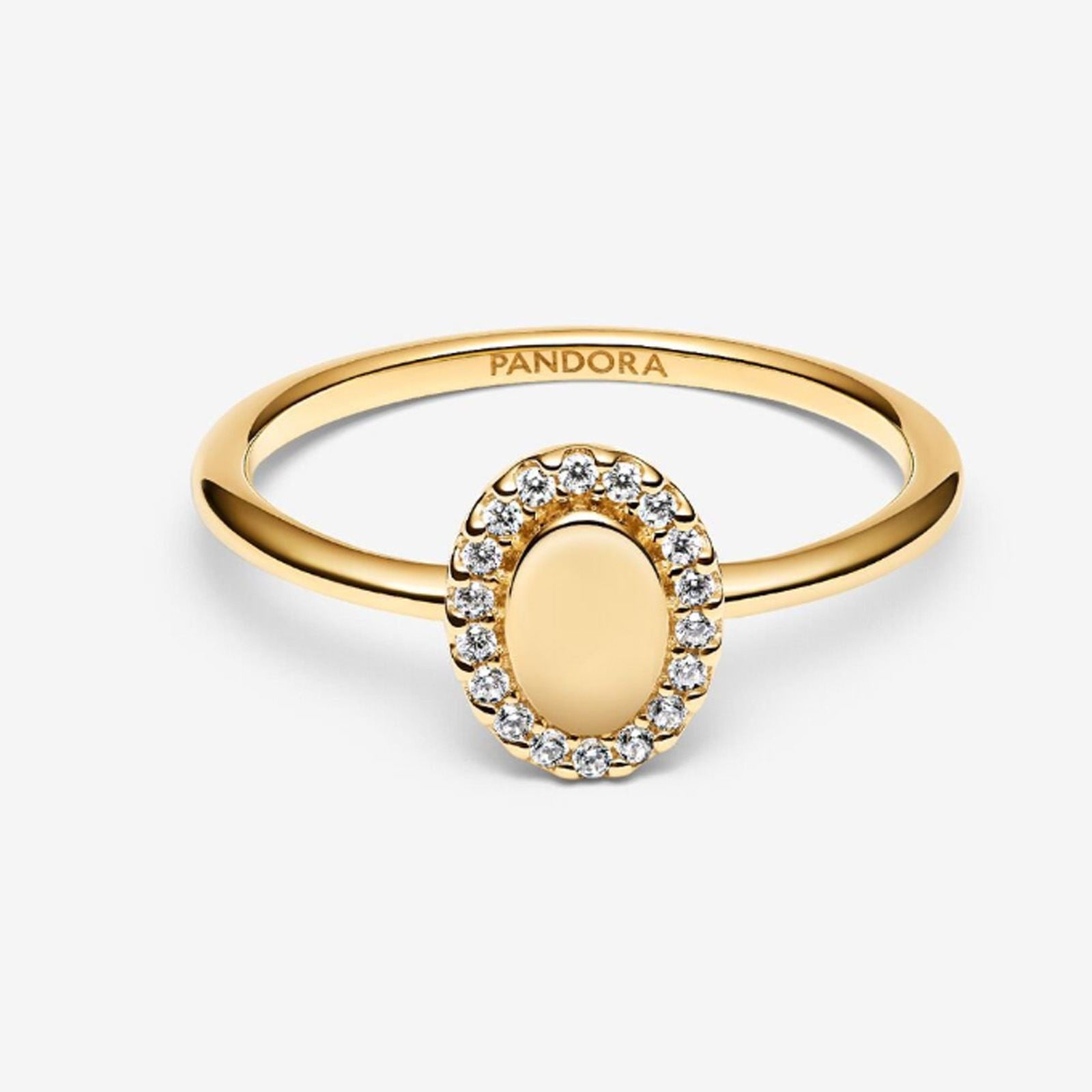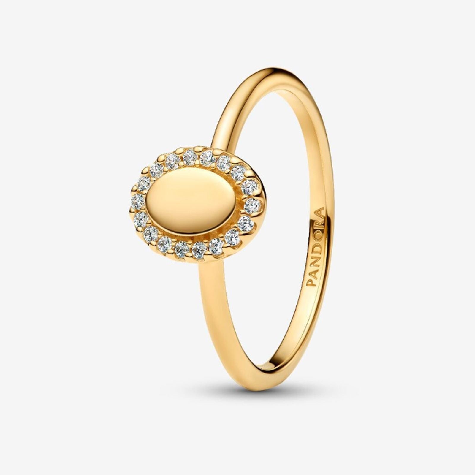 Gold Engravable Oval Halo Ring ¹ 50. A radiant oval framed by pav? offers space for a personal engraving. Add initials, a date, or a meaningful word to create a unique piece that keeps special moments close. ||? Gold Engravable Oval Halo Ring, Size 50.|? From the collection Pandora Essence.|? Genuine Pandora Rings.|? Handcrafted by artisans using their unique 14kt gold metal blend.|? Showcases a gold engravable oval centrepiece.|? Features a halo of sparkling stones around the oval.|? This is a ring size: UK: K+ / EU: 50.|